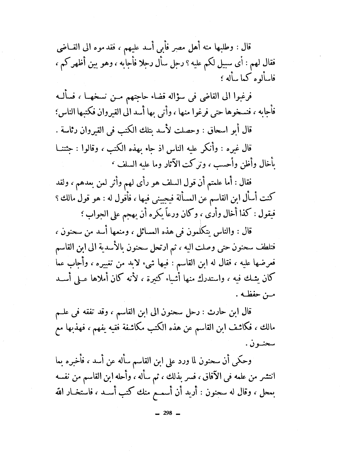 قال وطلبها منه أهل مصر، فأبى أسد عليهم، فقدموه إلى القاضي، فقال لهم: أي سبيل لكم عليه! رجل سأل رجلاً فأجابه وهو بين أظهركم فاسألوه كما سأله. فرغبوا إلى القاضي في سؤاله قضاء حاجتهم في نسخها، فسأله، فأجابه، فنسخوها، حتى فرغوا منها وأتى بها أسد إلى القيروان، فكتبها الناس. قال ابن سحنون: وحملت لأسد بتلك الكتب في القيروان - رياسة. قال غيره: وأنكر عليه الناسإ إذ0جاء بهذه الكتب، وقالوا أجئتنا بأخال وأظن وأحسب، وتركت الآثار وما عليه السلف. فقال: أما علمتم أن قول السلف هو رأي لهم وأثر لمن بعدهم، ولقد كنت أسال ابن القاسم عن مسألة فيجيبني فيها، فأقول له: هو قول مالك؟ فيقول: كذا أخال وأرى وكان وربما. ورعاً يكره أن يهجم على الجواب. قال: والناس يتكلمون في هذه المسائل، ومنعها اسد من سحنون، فتلطف سحنون حتى وصلت إليه. ثم ارتحل سحنون بالأسدية إلى ابن القاسم فيها شيء لا بد من تفسيره، وأجاب عما كان يشك فيه، واستدرك فيها أشياء كثيرة، لأنه كان أملاها على أسد من حفظه. قال ابن الحارث: رحل سحنون إلى ابن القاسم وقد تفقه في علم مالك. فكاشف ابن القاسم عن هذه الكتب مكاشفة فقيه يفهم، فهذبها مع سحنون، وحكي أن سحنون لما ورد على ابن القاسم سأله عن أسد فأخبره بما انتشر من علمه في الآفاق، فسرّ بذلك. ثم سأله وأحله ابن القاسم من نفسه بمحل، وقال له سحنون: أريد أن أسمع منك كتب أسد فاستخار الله