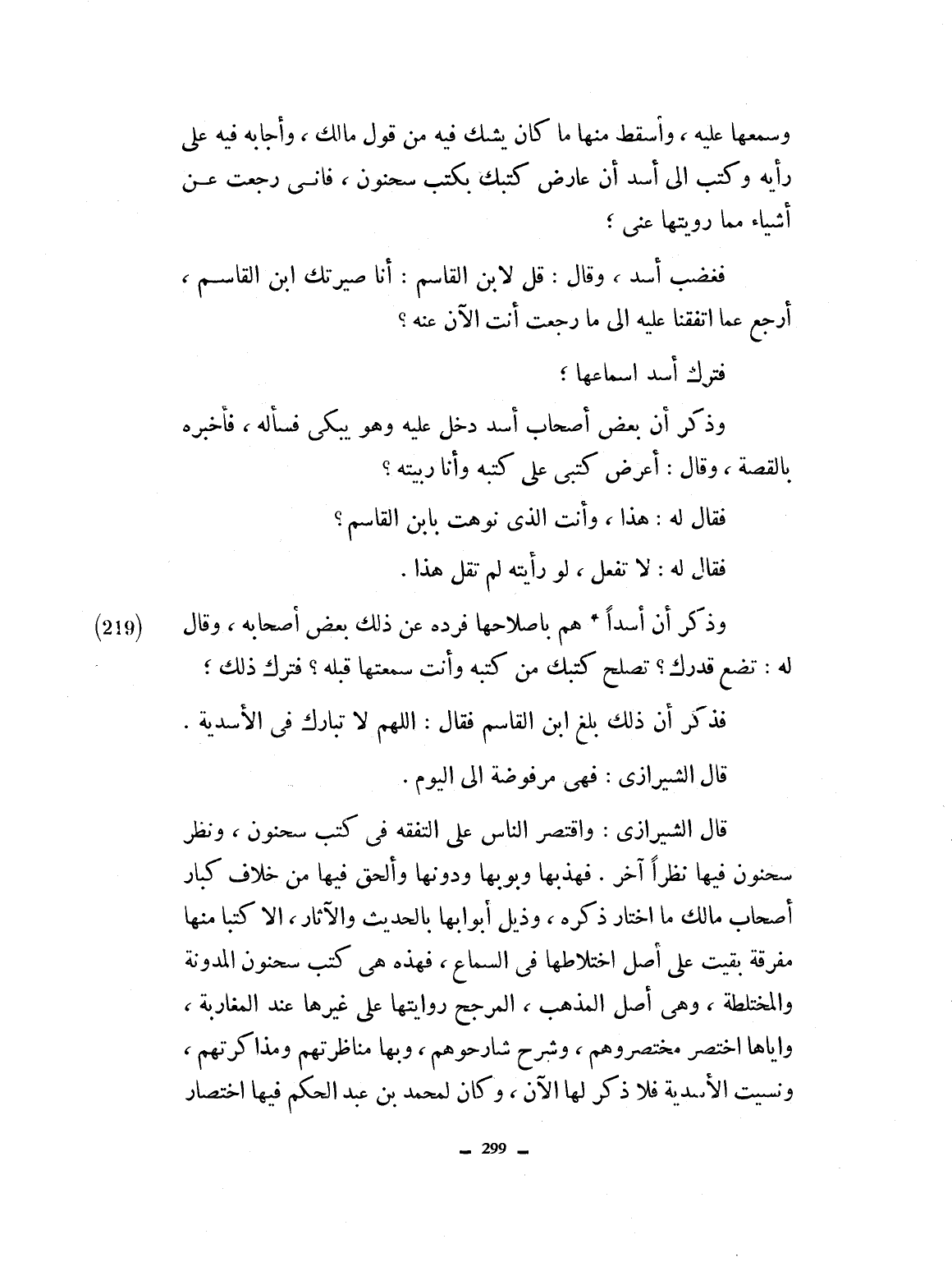 وقال أعرض كتبي على كتبه وأنا ربيته؟ فقال له هذا: وأنت الذي نوهت لابن القاسم، فقال له لا تفعل. لو رأيته لم تقل هذا. وذكر أن أسداً همّ بإصلاحها، فرده عن ذلك بعض أصحابه، وقال لا تضع قدرك تصلح كتبك من كتبه وأنت سمعتها قبله؟ فترك ذلك. وذكر أن ذلك بلغ ابن القاسم، فقال: اللهم لا تبارك في الأسدية. قال الشيرازي فهي مرفوضة إلى اليوم. قال الشيرازي: واقتصر الناس على التفقه في كتب سحنون، ونظر سحنون فيها نظراً آخر فهذبها، وبوّبها ودونّها، والحق فيها من خلاف كبار أصحاب مالك ما أختار ذكره، وذيّل أبوابها بالحديث والآثار، إلا كتباً منها مفرقة، بقيت على اصل اختلاطها في السماع، فهذه هي كتب سحنون المدونة والمختلطة. وهي أصل المذهب المرجح روايتها على غيرها، عند المغاربة، وإياها اختصر مختصروهم وشرح شارحوههم، وبها مناظرتهم ومذاكرتهم، ونسيت الأسدية فلا ذكر لها الآن وكان لمحمد بن عبد الحكم فيها اختصار،