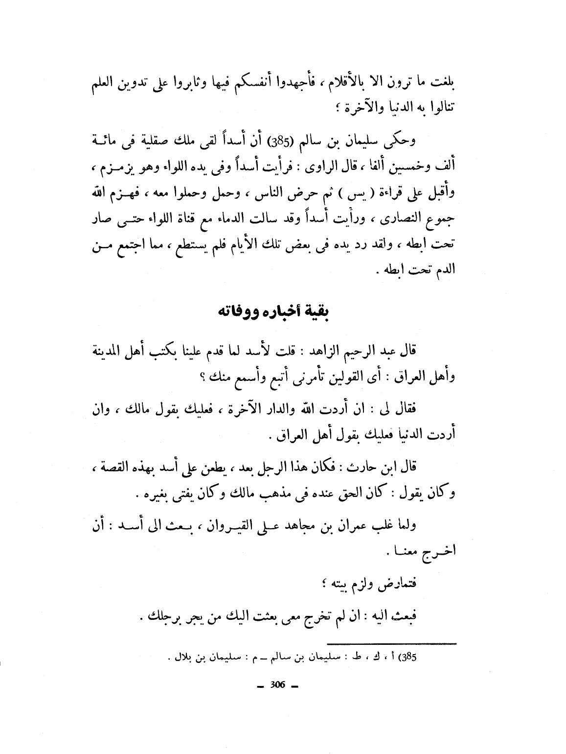 بلغت ما ترون إلا بالإقلام فاجتهدوا أنفسكم فيها، وثابروا على تدوين العلم، تنالوا به الدنيا والآخرة. وحكى سليمان بن سالم أن أسداً لقي ملك صقلية في مائة ألف وخمسين ألفاً. قال الرواي فرأيت أسداً لقي ملك صقلية في مائة ألف وخمسين ألفاً. قال الرواي فرأيت أسداً وفي يده اللواء وهو يزمزم وأقبل على قراءة يس، ثم حرض الناس، وحمل وحملوا معه، فهزم الله جموع النصارى، ورأيت أسداً وقد سالت الدماء على قناة اللواء.