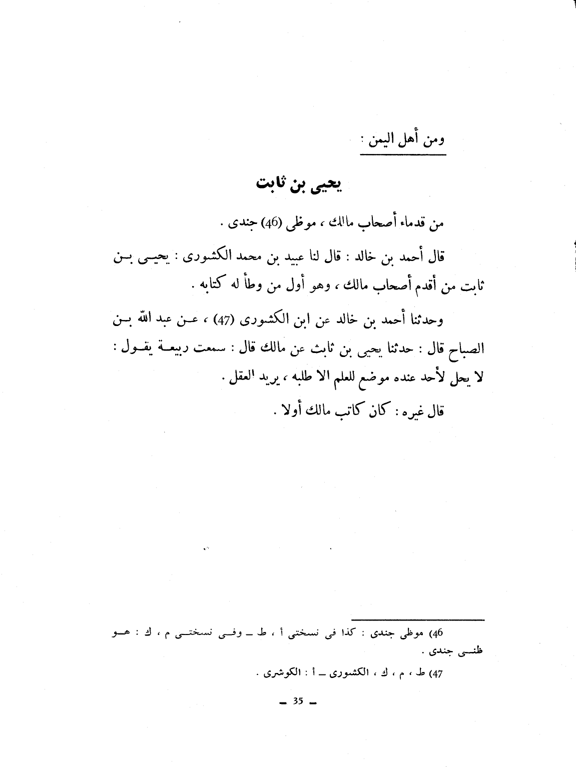 من قدماء أصحاب مالك هو ظيني جندي. قال أحمد بن خالد: قال لنا عبيد بن محمد الكشوري: يحيى بن ثابت من اقدم أصحاب مالك. وهو أول من وطأ له كتبه. وحدثنا أحمد بن خالد عن ابن الكشوري عن عبد الله بن الصباح، قال: حدثنا يحيى بن ثابت عن مالك، قال: سمعت ربيعة يقول لا يحل لأحد عنده موضع العلم إلا طلبه يريد العقل هكذا قال غيره: كان كاتب مالك أولاً.
