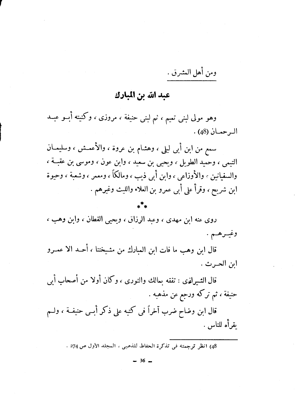وهو مولى بني تميم. ثم لبني حنيفة مروزي وكنيته أبو عبد الرحمان. سمع من ابن أبي ليلى وهشام بن عروة والأعمش وسليمان التيمي وحميد الطويل ويحيى بن سعيد وابن عون وموسى بن عقبة والسفيانيين والأوزاعي وابن أبي ذئب ومالكاً ومعمراً وشعبة وحيوة بن شريح وقرأ على أبي عمرو بن العلاء والليث وغيرهم. روى عنه ابن مهدي وعبد الرزاق ويحيى القطان وابن وهب وغيرهم. قال ابن وهب: ما فات ابن المبارك من مشيختنا إلا عمرو بن الحارث. قال الشيرازي تفقه بمالك والثوري، وكان أولاً من أصحاب أبي حنيفة ثم تركه ورجع عن مذهبه. قال ابن وضاح: ضرب آخراً في كتبه على أبي حنيفة ولم يقرأه للناس.