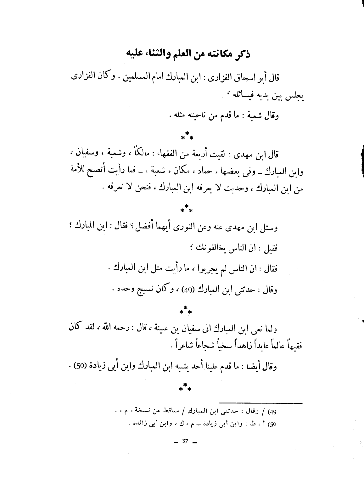قال أبو إسحاق الفزاري: ابن المبارك إمام المسلمين. وكان الفزاري يجلس بين يديه فيسأله. وقال شعبة: ما قدم من ناحيته مثله. قال ابن مهدي: لقيت أربعة من الفقهاء: مالكاً وشعبة وسفيان وابن المبارك. وفي بعضها: حماد، مكان شعبة. فما رأيت أنصح للأمة من ابن المبارك وحديث لا يعرفه ابن المبارك لا نعرفه. وسئل ابن مهدي عنه وعن الثوري أيهما أفضل، فقال ابن المبارك. فقيل له: إن الناس يخالفونك. قال: الناس لم يجربوا. ما رأيت مثل ابن المبارك. وكان ينسخه وحده. ولما نعي ابن المبارك إلى سفيان بن عيينة قال: رحمه الله. لقد كان فقيهاً عالماً عابداً زاهداً سجيناً شجاعاً شاعراً. وقال أيضاً: ما قدم علينا أحد يشبه ابن المبارك وابن أبي زائدة.