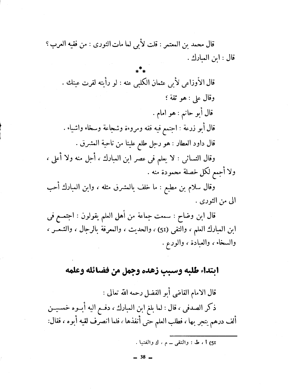 قال الإمام القاضي أبو الفضل رحمه الله تعالى: ذكر الصدفي، قال: لما بلغ ابن المبارك دفع إليه أبوه خمسين ألف درهم يتجر بها، فطلب العلم حتى أفقدها، فلما انصرف لقيه أبوه، فقال: