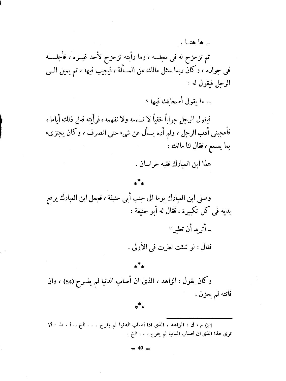 هاهنا. ثم تزحزح له في مجلسه، وما رأيته تزحزح لأحد غيره. فأجلسه في جواره، وكان ربما سأل مالكاً عن المسألة فيجيب فيها ثم يميل إلى الرجل ويقول له: ما يقول أصحابك فيها؟ فيقول الرجل جواباً خفياً لا نسمعه ولا نفهمه، فرأيته فعل ذلك أياماً، فأعجبني أدب الرجل، ولم أره يسأل عن شيء حتى انصرف كان يجيز بما سمع. فقال لنا مالك: هذا ابن المبارك فقيه خراسان. وصلى ابن المبارك يوماً إلى جنب أبي حنيفة أتريد أن تطير؟ فقال: لو شهيت لطرت في الأولى. وكان يقول الزاهد الذي إذا أصاب الدنيا لم يفرح، وإذا فاتته لم يحزن.