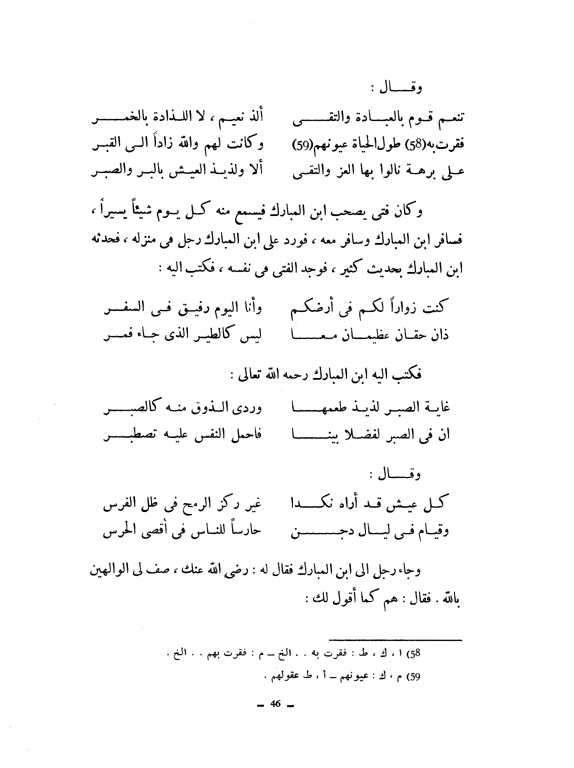 وكان فتى يصحب ابن المبارك يسمع منه كل يوم شيئاً يسيراً، فسافر ابن المبارك وسافر معه، فورد على ابن المبارك رجل في منزله فحدثه ابن المبارك بحديث كثير فوجد الفتى في نفسه فكتب إليه: