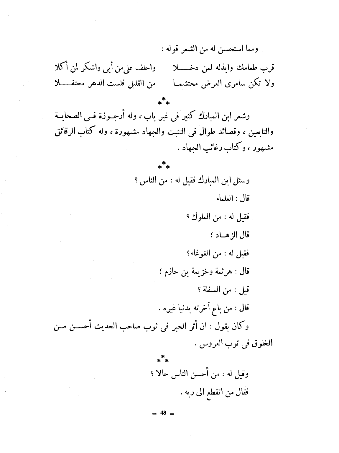 وشعر ابن المبارك كثير في غير باب وله أرجوزة في الصحابة والتابعين وقصائد طوال في التثبت والجهاد مشهورة، وله كتاب الرقائق مشهور، وكتاب رغائب الجهاد. وسئل ابن المبارك فقيل له: من الناس؟ قال: العلماء. قيل فمن الملوك؟ قال الزهاد. قيل: فمن الغوغاء؟ قال: هرثة وخزيمة. وقيل من السفلة؟ قال من باع آخرته بدنيا غيره. وكان يقول: إن أثر الحبر في ثوب صاحب الحديث أحسن من الخلوق في ثوب العروس. وقيل له من أحسن الناس حالاً؟ فقال: من انقطع إلى ربه.