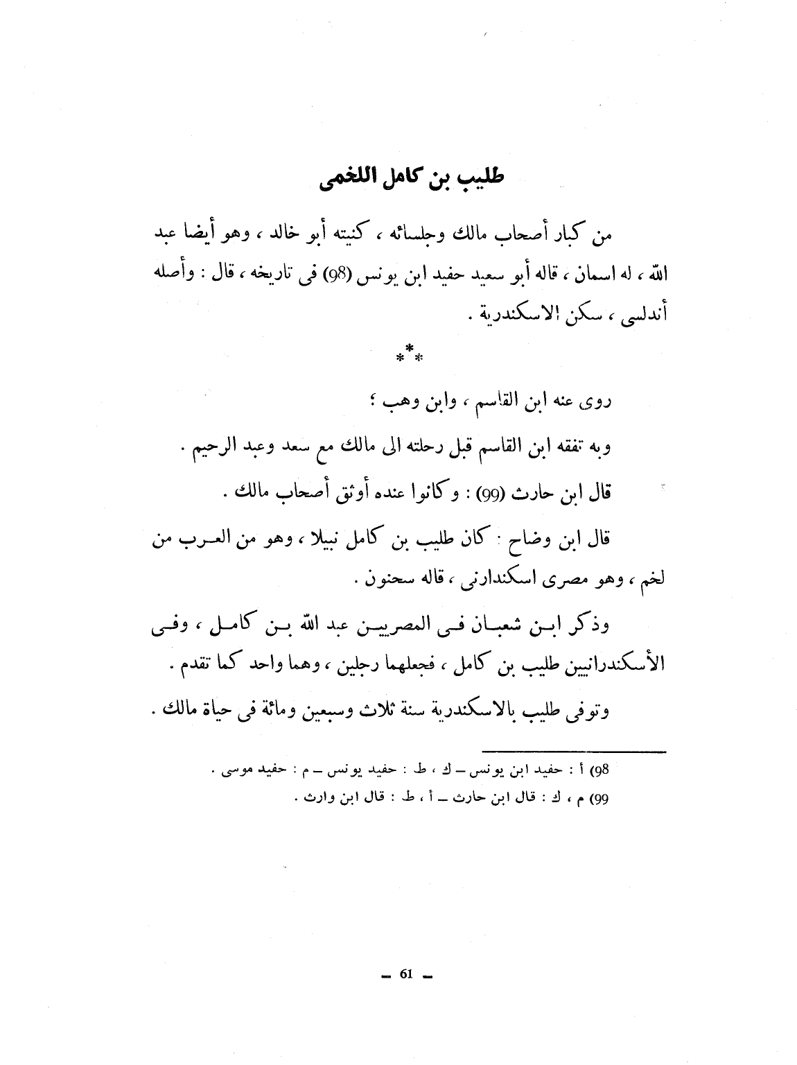 من كبار أصحاب مالك وجلسائه. كنيته أبو خالد وهو أيضاً أبو عبد الله له اسمان قاله أبو سعيد حفيد مؤنس في تاريخه. قال وأصله أندلسي سكن الإسكندرية. روى عنه ابن القاسم وابن وهب وبه تفقه ابن القاسم قبل رحلته إلى مالك مع سعد وعبد الرحمان. قال ابن حارث: وكانوا عنده أوثق أصحاب مالك. قال ابن وضاح: كان طليب بن كامل نبيلاً وهو من العرب من لخم، وهو مصري اسكندراني. قاله سحنون. وذكر ابن شعبان في المصريين عبد الله بن كامل. وفي الاسكندرانيين طليباً بن كامل فجعلهما رجلين وهما واحد كما تقدم. وتوفي طليباً بن كامل فجعلهما رجلين وهما واحد كما تقدم. وتوفي طليب بالإسكندرية سنة ثلاث وسبعين ومائة في حياة مالك.