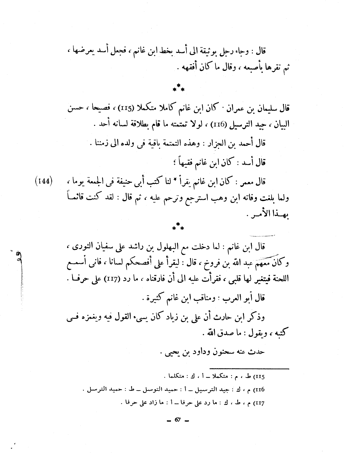 قال وجاء رجل مرة بوثيقة إلى أسد بخط ابن غانم فجعل أسد يعرضها ثم تعربها بإصبعه، وقال: ما كان أفقهه. قال سليمان بن عمران: ابن غانم كاملاً متكملاً فصيحاً حسن البيان جيد الترتيل، لولا تمتمته ما قام بطلاقة لسانه أحد. قال أحمد بن الجزار: وهذه التمتمة الباقية في ولده إلى زمننا. قال أسد: كان ابن غانم فقيهاً. قال معمر: كان ابن غانم يقرئنا كتب أبي حنيفة في الجمعة يوماً. ولما بلغت وفاته ابن وهب استرجع وترحم عليه، ثم قال: لقد كان قائماً بهذا الأمر. قال ابن غانم: لما دخلت مع البهلول ابن راشد على سفيان الثوري وكان معهم عبد الله بن فروخ، قال: ليقرأ علي أفصحكم لساناً. فإني أسمع اللحنة فيتغير لها قلبي. فقرأت عليه إلى أن فارقته، ما رد علي حرفاً. قال أبو العرب ومناقب ابن غانم كثيرة وذكر ابن حارث أن علي بن زياد كان يسيء القول فيه ويغمزه في كتبه، ويقول ما صدق والله. حدث عنه سحنون وداود بن يحيى.