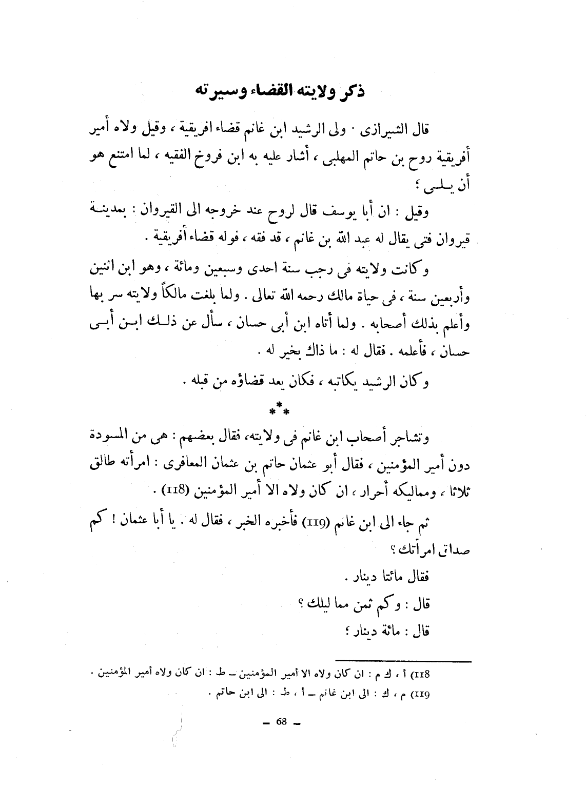 فقال أبو عثمان المعافري: امرأته طالق ثلاثاً ومماليكه أحرار، إن كان ولاه إلا أمير المؤمنين، ثم جاء إلى ابن غانم فأخبره الخبر، فقال لا يا أبا عثمان، كم صداق امرأتك؟ فقال مائتا دينار.