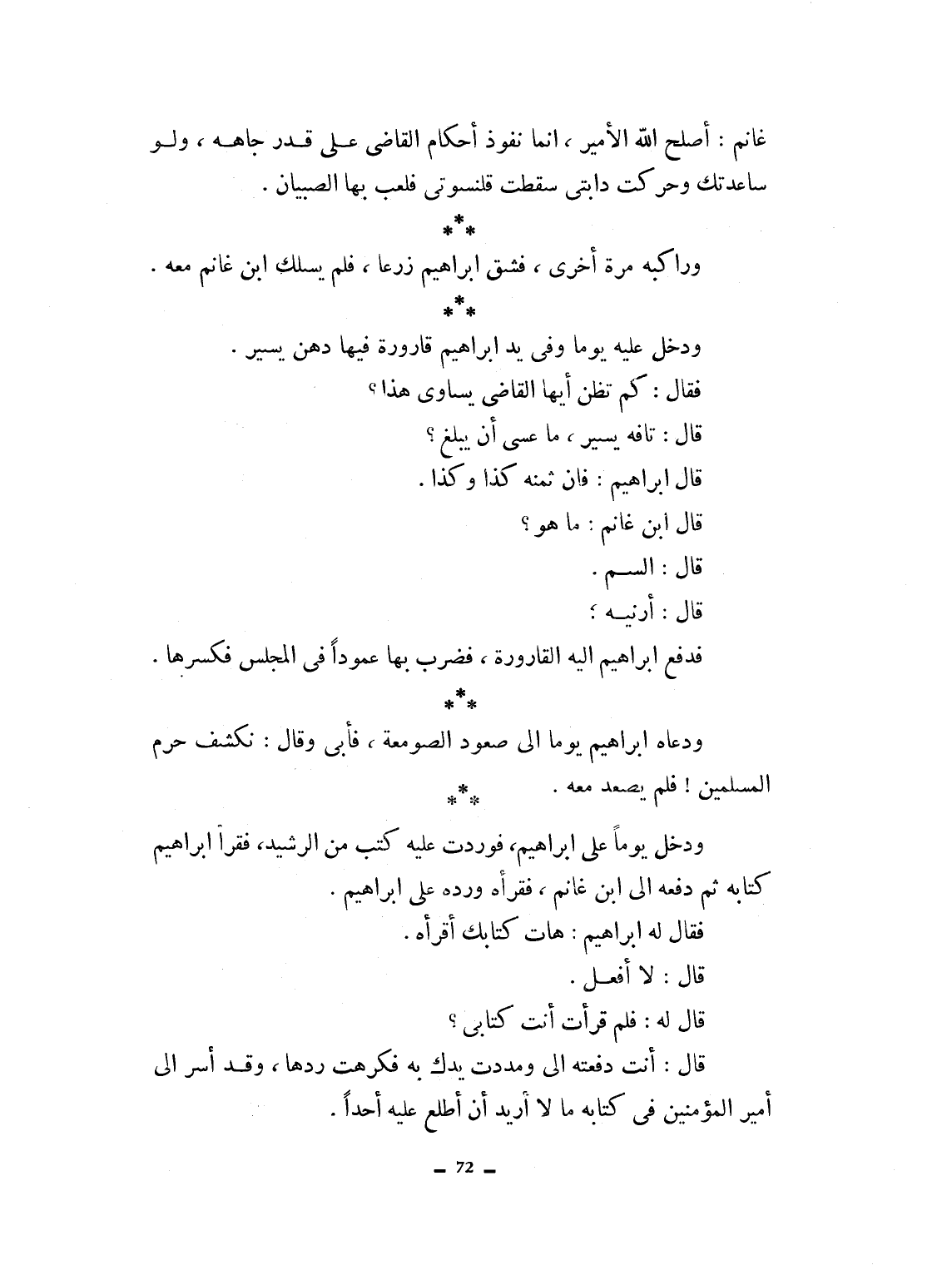 غانم أصلح الله الأمير إنما نفوذ أحكام القاضي على قدر جاهه، ولو ساعدتك وحركت دابتي سقطت قلنسوتي فلعب بها الصبيان. وراكبه مرة، فشق إبراهيم زرعاً فلم يسلك ابن غانم معه. ودخل عليه يوماً وفي يد إبراهيم قارورة فيها دهن يسير، قال كم تظن أيها القاضي يساوي هذا؟ قال تافه، فكم عسى أن يبلغ؟ قال إبراهيم فإن ثمنه كذا وكذا. قال ابن غانم: ما هو؟ قال السم. قال أرنيه. فدفع إليه إبراهيم القارورة ضرب بها عموداً في المجلس فكسرها. ودعاه إبراهيم يوماً إلى صعود الصومعة فأبى، وقال: نكشف حرم المسلمين، فلم يصعد معه. ودخل يوماً على إبراهيم فوردت عليه كتب من الرشيد، فقرأ إبراهيم كتابه ثم دفعه إلى ابن غانم فقرأه ورده على إبراهيم. فقال له إبراهيم هات كتابك أقرأه قالا لا أفعل قال له: فلم قرأت أنت كتابي. قال أنت دفعته إلي ومددت يدك به فكرهت ردها. وقد اسر أمير المؤمنين في كتابه ما لا أريد أن أطلع عليه أحداً.