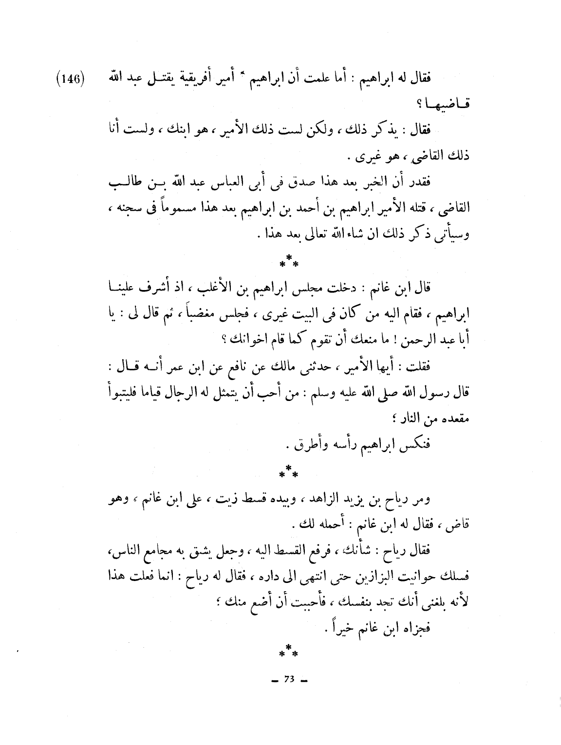 فقال له إبراهيم: أما علمت أن إبراهيم أمير أفريقية يقتل عبد الله قاضيها؟ فقال: يذكر ذلك. ولكن لست ذلك الأمير، هو ابنك ولست ذلك القاضي، هو غيري. فقدر أن الخبر بعد هذا، صدق في أبي العباس عبد الله بن طالب القاضي قتله الأمير إبراهيم بن أحمد بن إبراهيم بعد هذا مسموماً في سجنه. وسيأتي ذكره بعد هذا إن شاء الله. قال ابن غانم: دخلت مجلس إبراهيم بن الأغلب، إذ أشرف علينا إبراهيم فقام إليه من كان في البيت غيري. فجلس مغضباً ثم قال لي: يا أبا عبد الرحمان ما منعك أن تقوم كما قام أخواك؟ فقلت أيها الأمير: حدثني مالك عن نافع عن ابن عمر، قال: قال رسول الله صلى الله عليه وسلم: من أحب أن يتمثل له الرجال قياماً فليتبوأ مقعده من النار. فنكس إبراهيم رأسه وأطرق. ومر رباح بن يزيد الزاهد وبيده قسط زيت على ابن غانم وهو قاض، فقال لها ابن غانم: احمله لك. فقال رباح شأنك. فرفع القسط إليه وجعل يشق به مجامع الناس فسلك به حوانيت البزازين حتى انتهى إلى داره. فقال رباح إنما فعلت هذا، لأنه بلغني عنك أنك تجد بنفسك، فأحببت أن أضع منك. فجزاه ابن غانم خيراً