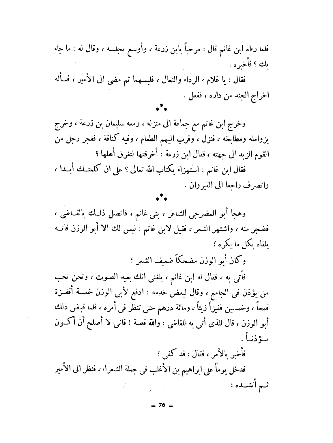 فلما رآه ابن غانم قال مرحباً بابن زرعة وأوسع مجلسه وقال له: ما جاء بك؟ فأخبره فقال يا غلام الرداء والنعال. فلبسهما ثم مضى إلى الأمير، فسأله إخراج الجند من داره، ففعل. وخرج ابن غانم مع جماعة إلى منزله ومعه سليمان بن زرعة وخرج بزوائله ومطانجه فنزل وقرب إليهم الطعام وفيه كنافة فجر رجل من القوم الزبد إلى جهته، فقال ابن زرعة: أخرقتها لتغرق أهلها؟ فقال ابن غانم: استهزاء بكتاب الله تعالى؟ لله علي أن كلمتك أبداً. وانصرف راجعاً إلى القيروان. وهجا أبو المضرجي الشاعر بني غانم فاتصل ذلك بالقاضي فضجر منه واشتهر الشعر فقيل لابن غانم: ليس لك إلا أبا الوزن، فإنه يلقاه بكل ما يكره. وكان أبو الوزن مضحكاً ضعيف الشعر. فأتي به، فقال ابن غانم: بلغني أنك بعيد الصوت ونحن نريد من يؤذن في الجامع. وقال لبعض خدمه: ادفع لأبي الوزن خمسة أقفزة قمحاً وخمسين قفيزاً زيتاً ومائة درهم، حتى ننظر في أمره. فلما قبض ذلك أبو الوزن قال للذي أتى به للقاضي: والله قصة، فإني لا أصلح أن أكون مؤذناً، فأخبر بالأمر، فقال: قد كفي. فدخل يوماً على إبراهيم بن الأغلب في جملة الشعراء فنظر إلى الأمير ثم أنشده: