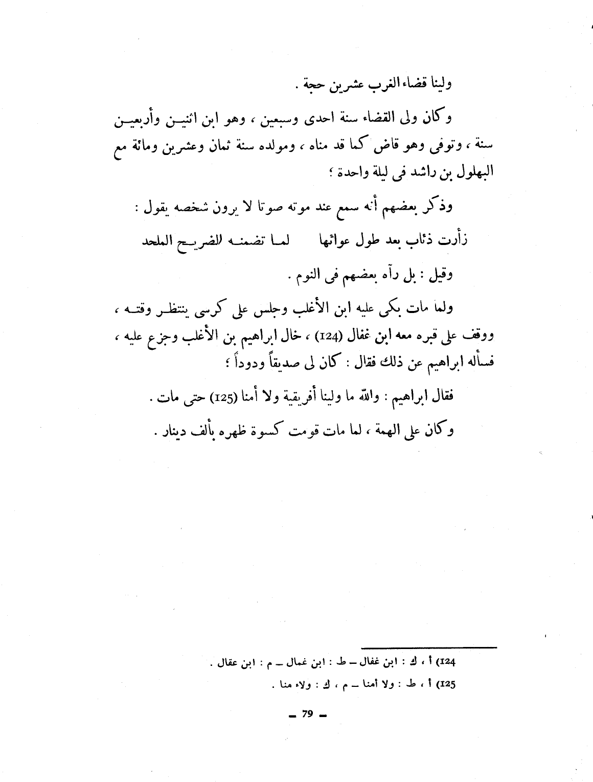 ولينا قضاء الغرب عشرين حجة وكان ولي القضاء سنة إحدى وسبعين وهو ابن اثنتين وأربعين وتوفي وهو قاض كما قدمناه ومولده سنة ثمان وعشرين ومائة مع البهلول بن راشد في ليلة واحدة. وذكر بعضهم أنه سمع عند موته صوتاً لا يرون شخصاً يقول: