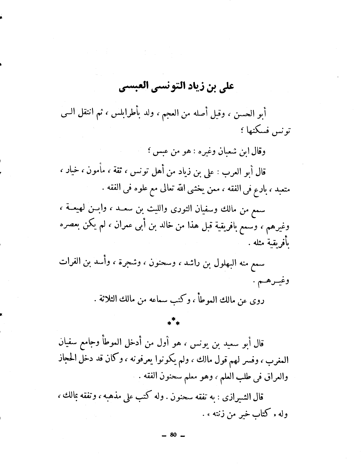 أبو الحسن. وقيل أصله من العجم ولد بطرابلس، ثم انتقل إلى تونس فسكنها. وقال ابن شعبان وغيره هو من عبس. قال أبو العرب علي بن زياد من أهل تونس ثقة مأمون (خير) متعبد بارع في الفقه ممن يخشى اله عز وجل مع علوه في الفقه. سمع من مالك وسفيان الثوري والليث ابن سعد، وابن لهيعة وغيرهم. وسمع بإفريقية قبل هذا من خالد بن أبي عمران، لم يكن بعصره بإفريقية مثله. سمع منه البهلول بن راشد وسحنون وشجرة وأسد بن الفرات وغيرهم. وروى عن مالك الموطأ، وكتب سماعه من مالك الثلاثة. قال ابو سعد بن يونس: هو أول من ادخل الموطأ وجامع سفيان المغرب، وفسر لهم قول مالك ولم يكونوا يعرفونه. وكان قد دخل الحجاز والعراق في طلب العلم وهو معلم سحنون الفقه. قال الشيرازي به تفقه سحنون وله كتب على مذهبه وتفقه بمالك وله كتاب خير من زنته.