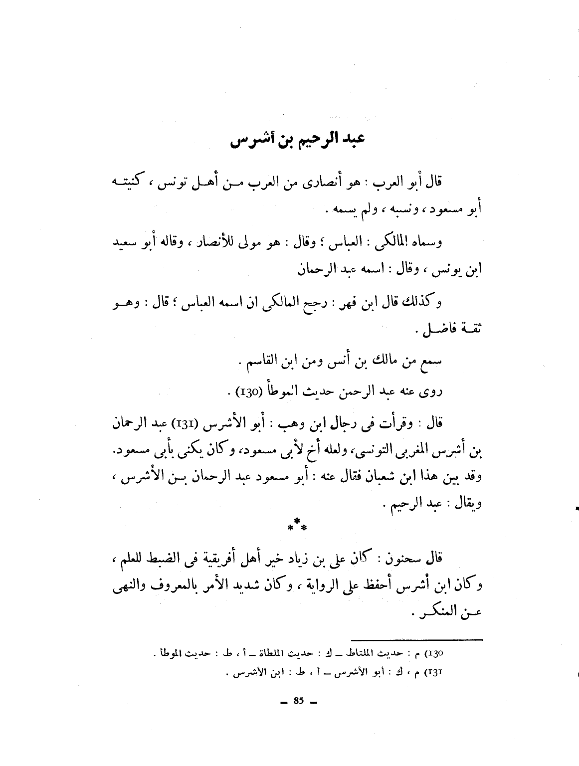 قال أبو العرب: هو أنصاري من العرب من أهل تونس كنيته أبو مسعود ونسبه ولم يسمه، وسماه المالكي العباس. وقالوا: هو مولى الأنصار. وقاله أبو سعيد بن يونس. وقال اسمه عبد الرحمان.... انتهى. وكذلك قال ابن فهر، رجح المالكي اسمه العباس، قال: وهو ثقة فاضل. سمع من مالك بن أنس ومن ابن القاسم. روى عنه عبد الرحمان حديث الموطأ. قال: وقرأت في رجال ابن وهب، أبو الأشرس عبد الرحمان بن أشرس المقري التونسي. ولعله أخا لأبي مسعود. وكان يكنى بأبي مسعود، وقد بين هذا ابن شعبان، فقال عنه أبو مسعود عبد الرحمان بن أشرس، ويقال عبد الرحيم، قال سحنون: كان علي بن زياد خير أهل أفريقية في الضبط للعلم، وكان ابن أشرس أحفظ على الرواية، وكان شديد الأمر بالمعروف والنهي عن المنكر.