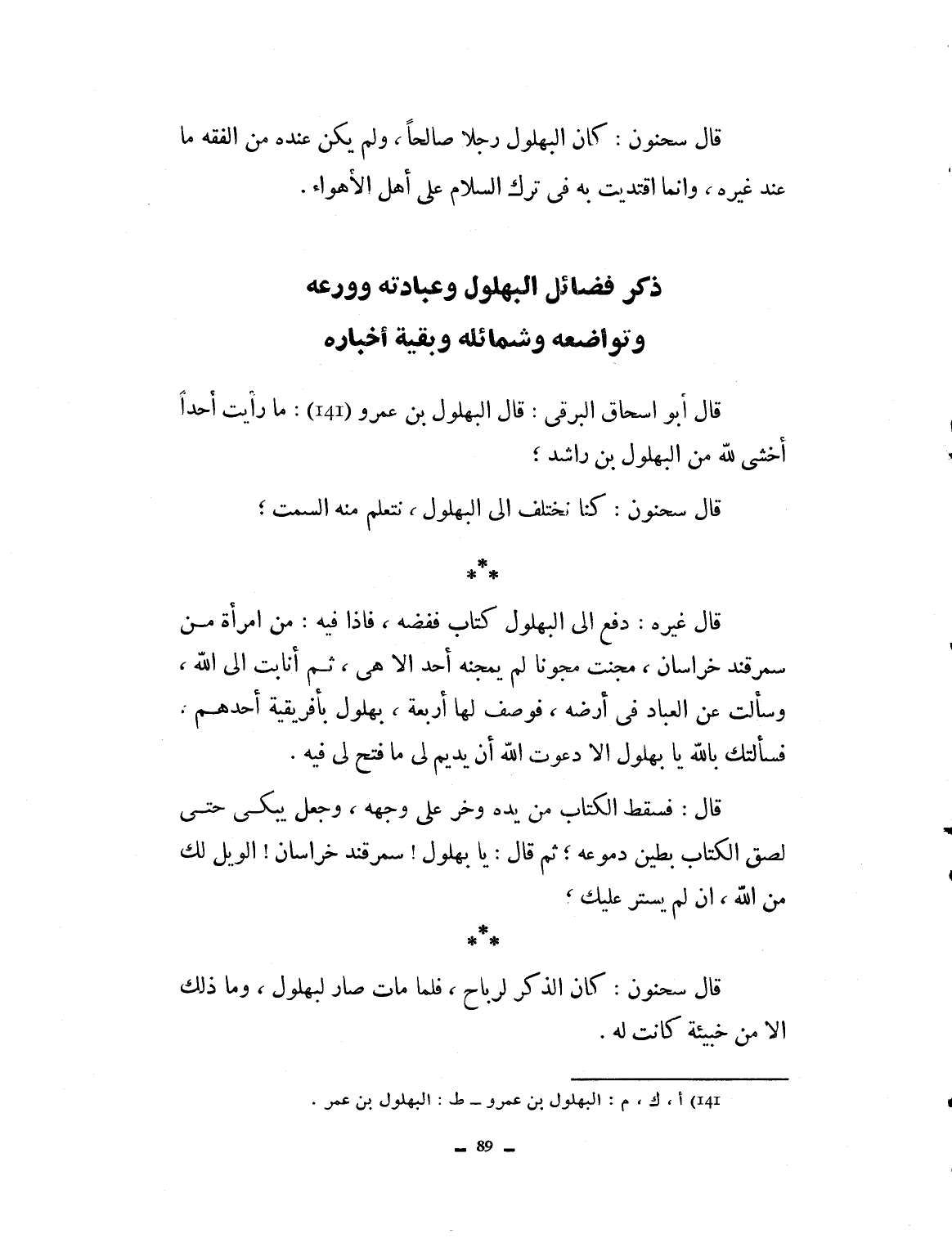 ذكر فضائل البهلول وعبادته وورعه