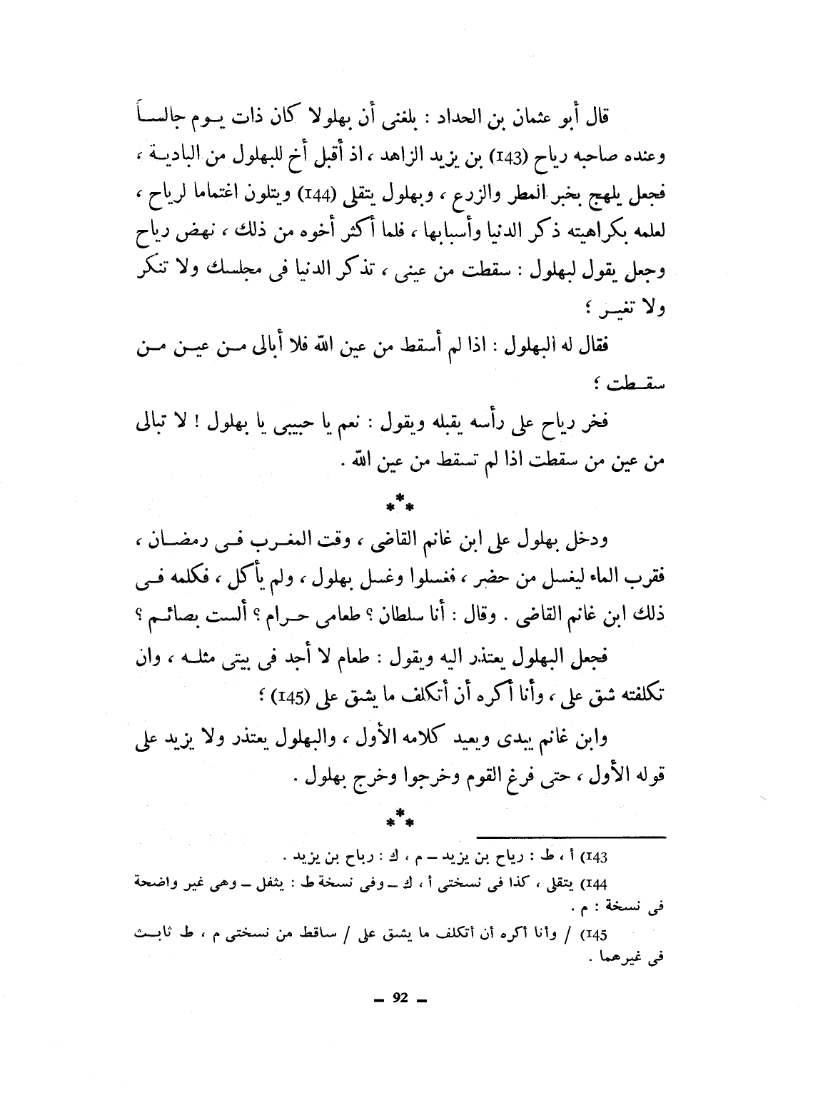 قال أبو عثمان بن الحداد بلغني أن بهلولاً كان ذات يوم جالساً وعنده صاحبه رباح بن يزيد الزاهد، إذ أقبل أخ للبهلول في البادية يلج بخبر المطر والزرع والبهلول يتلقى ويتلون اغتماماً لرباح، لعلمه بكراهيته ذكر الدنيا وأسبابها فلما أكثر أخوه من هذا نهض وجعل يقول لبهلول: سقطت من عيني، تذكر الدنيا في مجلسك ولا تغير. فقال له البهلول: إذا لم أسقط من عين الله فلا أبالي من عين من سقطت. فخر رباح على رأسه يقبله. نعم يا حبيبي يا بهلول لا تبالي من عين من سقطت، إذا المرء سقط من عين الله. ودخل بهلول على ابن غانم القاضي وقت المغرب في رمضان فقرب الماء ليغسل من حضر ففعلوا وغسل بهلول ولم يأكل. فكلمه في ذلك ابن غانم القاضي وقال: أنا سلطان طعامي حرام؟ ألست بصائم؟ فجعل البهلول يعتذر إليه ويقول طعام لا أجد في بيتي مثله، وإن تكلفت شق علي وأنا أمره أن أتكلف بما يشق علي. وابن غانم يهذر ويعيد كلامه الأول، والبهلول يعتذر ولا يزيد على قوله الأول، حتى فرغ القوم وخرجوا وخرج البهلول.