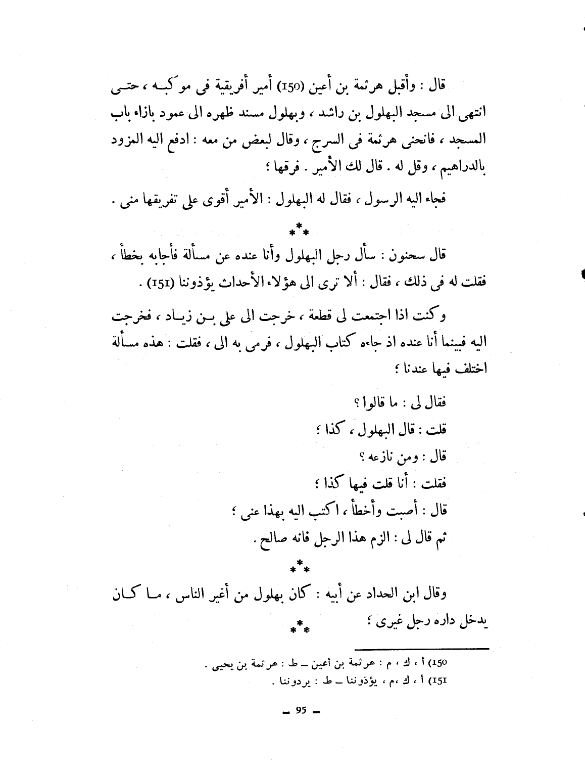 قال: واقبل هرثمة بن أعين أمير أفريقية في موكبه، حتى انتهى إلى مسجد البهلول بن راشد، وبهلول مسند ظهره إلى عمود بإزاء باب المسجد، فانحنى هرثمة في السرج، وقال لبعض من معه ادفع إليه هذا المزود بالدراهم وقل له قال لك الأمير فرقها. فجاء إليه الرسول فقال له البهلول الأمير أقوى على تفريقها. قال سحنون: سأل رجل البهلول وأنا عنده عن مسألة، فأجابه بخطأ فقلت له في ذلك، فقال: ألا ترى إلى هؤلاء الأحداث يؤذوننا. وكنت إذا اجتمع لي قطعة خرجت إلى علي بن زياد فخرجت إليه، فبينما أنا عنده جاءه كتاب البهلول فرمى به إلي. فقلت هذه مسألة اختلف فيها عندنا. فقال لي ما قالوا؟ قلت: قال البهلول كذا. قال ومن نازعه؟ فقلت أنا، قلت فيها كذا. قال أصبت وأخطأ. اكتب إليه بهذا عني. ثم قال لي: افرح بهذا الرجل فإنه صالح. قال ابن الحداد عن أبيه كان البهلول من أغير الناس، ما كان يدخل داره رجل غيري.