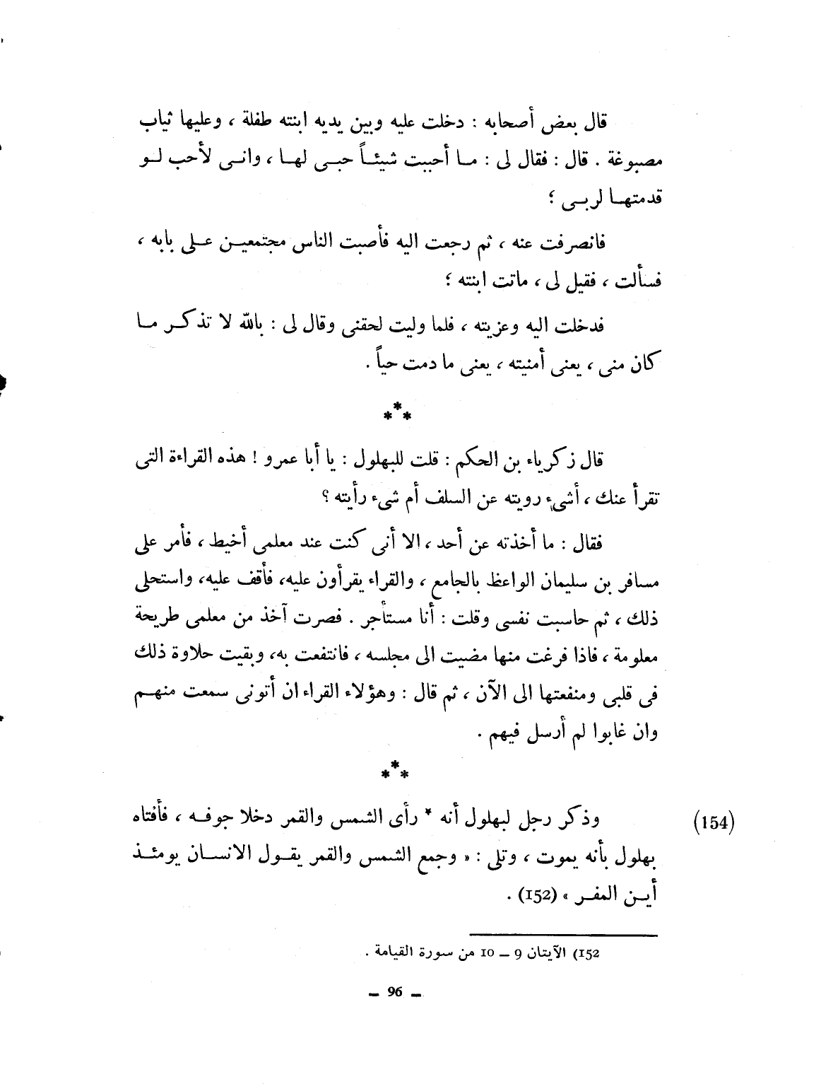 قال بعض أصحابه: دخلت عليه وبين يديه ابنته طفلة وعليها ثياب مصبوغة، فقال لي ما أحببت شيئاً حبي لها، وإني لأحب لو قدمتها لربي. فانصرفت عنه ثم رجعت إليه، فوجدت الناس مجتمعين على بابه فسألت، فقيل لي ماتت ابنته فدخلت إليه فعزيته فلما وليت لحقني وقال: بالله لا تذكر ما كان مني، يعني أمنيته، يعني ما دمت حياً. قال زكريا بن الحكم قلت للبهلول يا أبا عمر وهذه القراءة التي نقرأ عنكم الشيء رويته عن السلف أم شيء رأيته؟ فقال ما أخذته عن أحد إلا أني كنت عند معلمي أخيط فيمر علي سافر بن سليمان الواعظ بالجامع والقراء يقرأون عليه، فأقف إليه وأستحلي ذلك، ثم حاسبت نفسي وقلت أنا مستأجر، فصرت آخذ من معلمي طريحة معلومة، فإذا فرغت منها مضيت إلى مجلسه فانتفعت به وبقيت حلاوة ذلك في قلبي ومنفعتها إلى الآن، ثم قال وهؤلاء القراء إن أتوني سمعت منهم، وإن غابوا لم أرسل فيهم. وذكر رجل لبهلول أنه رأى الشمس والقمر ادخلا جوفه فأفتاه بهلول بأنه يموت وتلا: وجمع الشمس والقمر يقول ألإنسان يومئذ أين المفر.