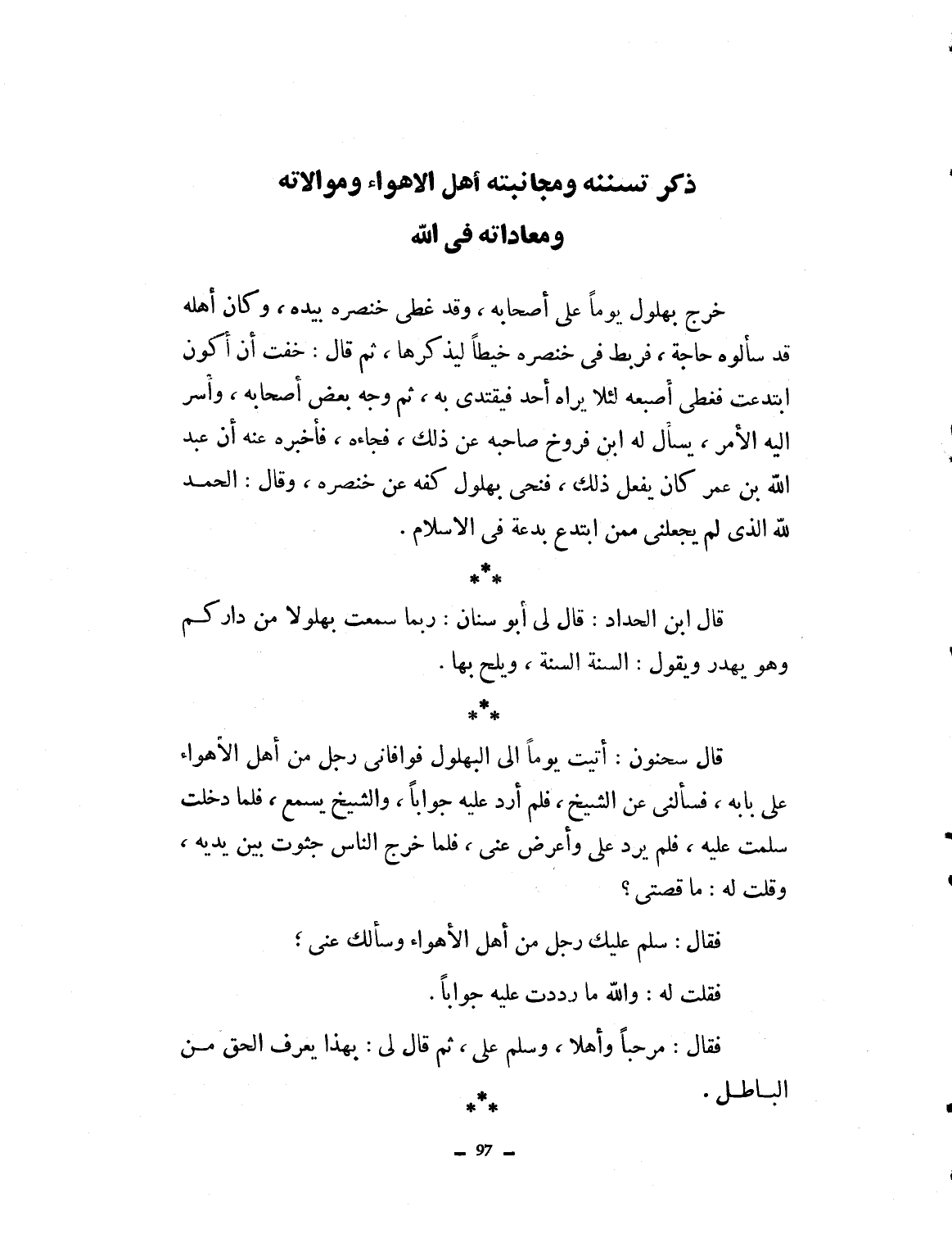 وخرج بهلول يوماً على أصحابه وقد غطى خنصره بيده وقد كان أهله سألوه حاجة، فربط في خنصره خطياً ليذكرها ثم قال: خفت أن أكون ابتدعت فغطى أصبعه لئلا يراه أحد فيقتدي به. ثم وجه بعض أصحابه واسر إليه الأمر فسأل ابن فروخ وصاحبه عن ذلك، فجاءه فأخبره عنه أن عبد الله بن عمر كان يفعل ذلك، فنحى بهلول كفه عن خنصره: وقال الحمد لله الذي لم يجعلني ممن ابتدع بدعة في الإسلام. قال ابن الحداد: قال لي ابن سنان ربما سمعت بهلولاً في داركم وهو يهدر ويقول السنة، ويلح بها. قال سحنون: أتيت يوماً إلى البهلول فوافاني رجل من أهل الأهواء على بابه يسألني عن الشيخ، فلم أرد عليه جواباً، والشيخ يسمع. فلما دخلت عليه سلمت فلم يرد علي وأعرض عني فلما خرج الناس جثوت بين يديه وقلت له ما قصتي؟ فقال سلم عليك رجل من أهل الأهواء وسألك عني. فقلت له: والله ما رددت عليه جواباً. فقال مرحباً أهلاً. وسلم علي. ثم قال لي بهذا يعرف الحق من الباطل.
