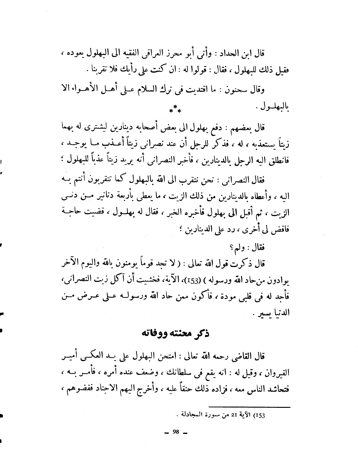 قال ابن الحداد: أتى أبو محرز العراقي الفقيه إلى البهلول يعوده فقيل ذلك البهلول، فقال: قولوا له إن كنت على رأيك فلا تقربنا. وقال سحنون: ما اقتديت في ترك السلام على أهل الأهواء إلا بالبهلول. قال بعضهم: دفع بهلول إلى بعض أصحابه دينارين ليشتري له بهما زيتاً يستفد به فذكر للرجل أن عند نصراني زيتاً أعذب ما يوجد. فانطلق إليه الرجل بالدينارين، فأخبر النصراني أنه يريد زيتاً عذباً لبهلول. فقال النصراني نتقرب إلى الله ببهلول كما تتقربون أنتم به إليه، وأعطاه بالدينارين من ذلك الزيت ما يعطى بأربعة دنانير من دنيء الزيت. ثم أقبل إلى بهلول فأخبره الخبر، فقال له بهلول قضيت حاجة فاقض لي أخرى، رد علي الدينارين. فقلت ولم؟ فقال ذكري قول الله تعالى: لا تجد قوماً يؤمنون بالله واليوم الآخر يوادون من حاد الله ورسوله. فخشيت ان آكل زيت النصراني فنجد له في قلبي مودة فأكون ممن حاد الله ورسوله على عرض من الدنيا يسير.