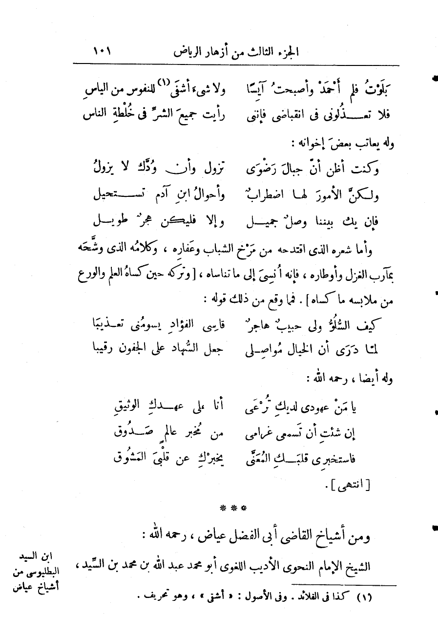 ومن أشياخ القاضي أبي الفضل عياض رحمه الله: الشيخ الإمام النحوي الأديب اللغوي أبو عبد الله بن محمّد بن السيد