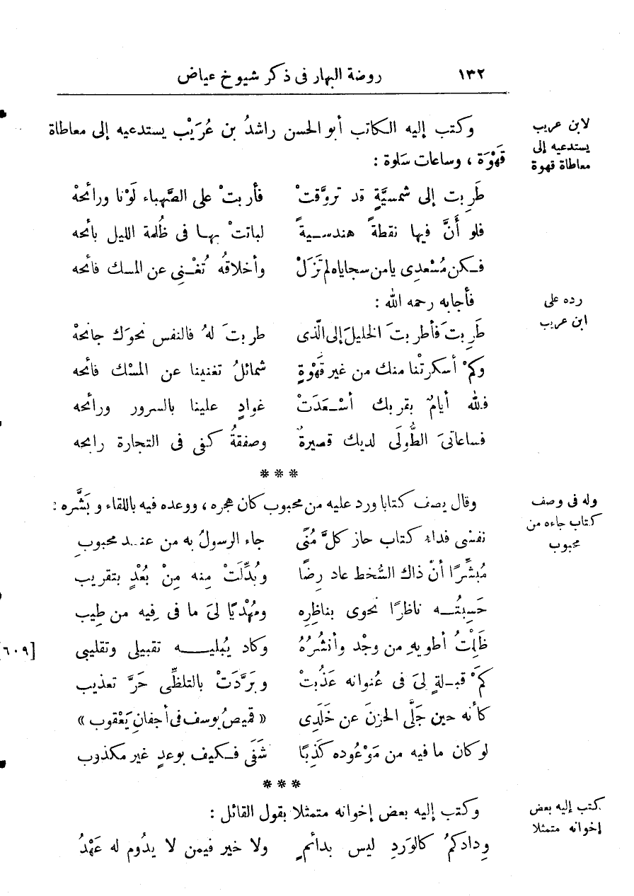وكتب إليه الكاتب أبو الحسن راشد بن عريب يستدعيه إلى معاطاة قهوة، ساعات سلوة: