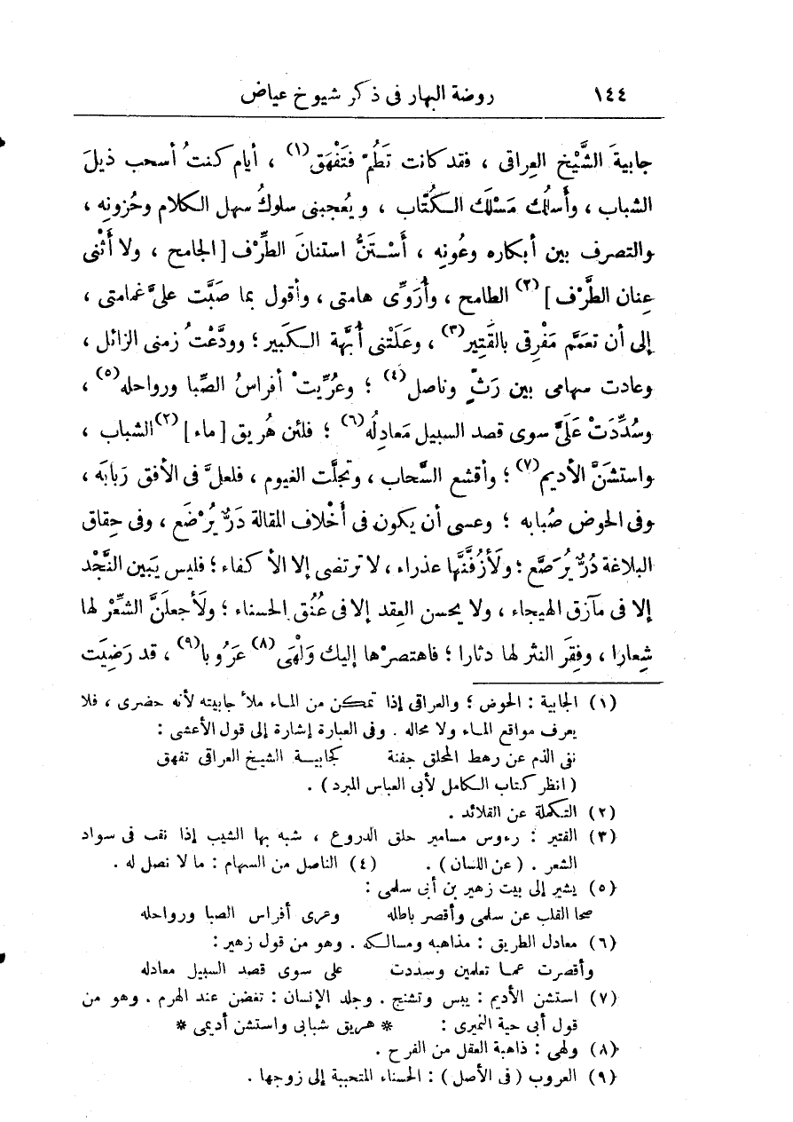 جابية الشيخ العراقي فقد كانت تطم فتفهق أيام كنت أسحب ذيل الشباب وأسلك مسلك الكتاب ويعجبني سلوك سهل الكلام وحوزته والتصرف بين أبكاره وعونه أستن استنان الطرف الجامح ولا أثنى عنان الطرف الطامح وأورى هامتي وأقول بما صبت على غمامتي إلى أنْ تعمم مفرقي بالقتير وعلتني أبهة الكبيرة وودعت زمني الزائل وعادت سهامي بين رث وناصل وعريت أفراس الصبا ورواحله وسددت على سوى قصد السبيل معادلة فلئن هريق ماء الشباب واستشن الأديم وأقشع السحاب وتجلت الغيوم فلعل في الأفق ربابه وفي الحوض صبابة وعسى أنْ يكون في أخلاف المقالة در يرضع في حقاق البلاغ در يرصع وزفنا عذراء لا ترضى إلاّ الأكفاء فليس يبين النجد إلاّ في مآزق الهيجاء ولا يحسن العقد إلاّ في عنق الحسناء ولأجعلن الشعر لها شعارا وفقر النثر لها دثارا فاهتصرها إليك ولهي عروبا قد رضيت