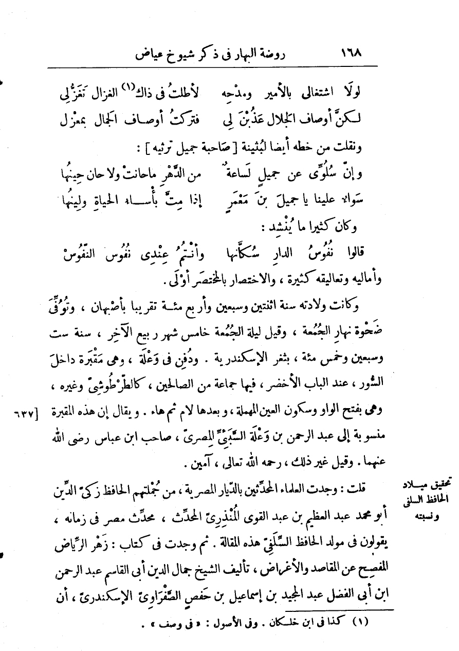 قلت: وجدت العلماء المحدثين بالديار المصرية من جملتهم الحافظ زكي الدين أبو محمّد عبد العظيم بن عبد القوي المنذري المحدث محدث مصر في زمانه يقولون في مولد الحافظ السفي هذه المقالة. ثم وجدت في كتاب: زهر الرياض المفصح عن المقاصد والأغراض تأليف الشيخ جمال الدين أبي القاسم عبد الرحمن ابن أبي الفضل عبد المجيد بن إسماعيل بن جفص الصفراوي الإسكندري وأنَّ