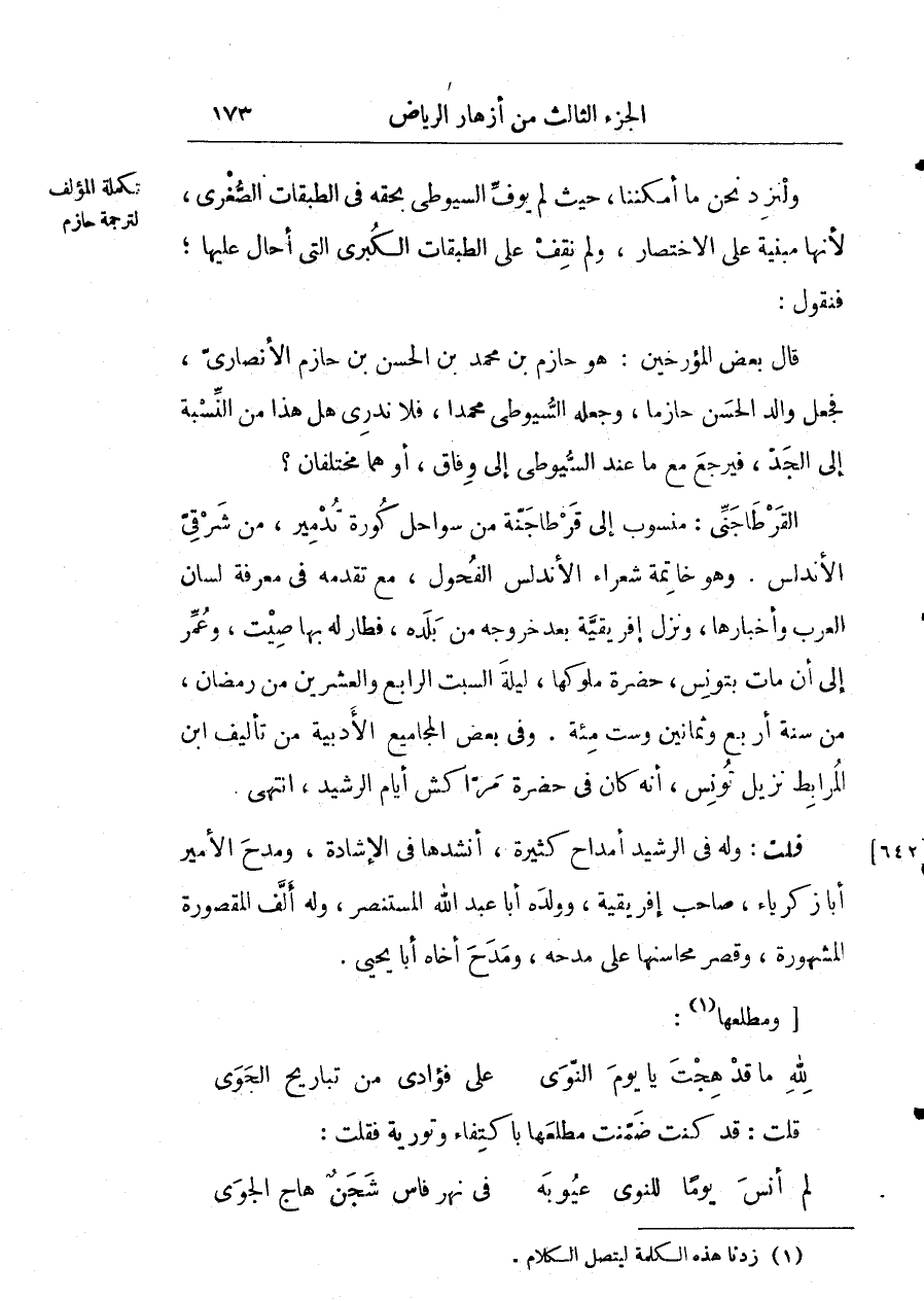 ولنرد نحن ما أمكننا، حيث لم يوف السيوطي بحقه في الطبقات الصغرى، لأنها مبنية على الاختصار، وليس نقف على الطبقات الكبرى التي أحال عليها؛ فنقول: قال بعض المؤرخين: هو حازم بن محمّد بن الحسن بن حازم الأنصاري، فجعل والد الحسن حازماً، وجعله السيوطي محمداً، فلا ندري هل هذا من النسبة إلى الجد، فيرجع مع ما عند السيوطي إلى وفاق، أو هما مختلفان؟ القرطاجني: منسوب إلى قرطاجنة من سواحل كورة تدمير، من شرقي الأندلس. وهو خاتمة شعراء الأندلس الفحول، مع تقدمه في معرفة لسان العرب وأخبارها، ونزل إفريقية بعد خروجه من بلده فطار بها صيت، وعمر إلى أنْ مات بتونس، حضره ملوكها، ليلة الرابع والعشرين من رمضان، من سنة أربع وثمانين وست مائة. وفي بعض المجاميع الأدبية من تأليف ابن المرابط نزل تونس، أنَّه كان في حضرة مراكش أيام الرشيد، انتهى.