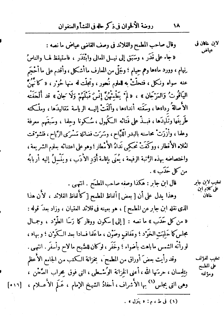 وهذا يدل على أنَّ بعض ألفاظ المطمح كألفاظ القلائد لأن هذا الذي نقله ابن جابر عن المطمح، هو بعينه في قلائد العقيان، وزاد بعد قوله: " من كل حدب " ما نصه: إلى سكون ووقار كما رسا الطود، وجمال مجلس كما حليت الخود، وعفاف وصون، ما علما فساد بعد الكون، وبهاء، لو رأته الشمس ما باهت بأضواء، وخفر، لو كان للصبح ما لاح وأسفر. انتهى.