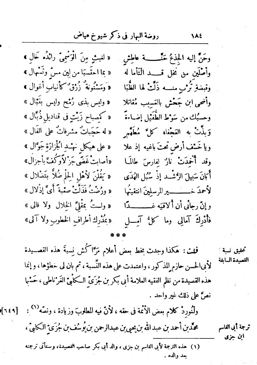 قلت: هكذا وجدت بخط بعض أعلام مراكش نسبة هذه القصيدة لأبي الحسن حازم المذكور، واعتمدت على هذه النسبة، ثم بان لي خطؤها، وإنّما هذه القصيدة من نظم العلامة أبي بكر بن جزي الكلبي الغرناطي، حسبما نص على ذلك غير واحد.