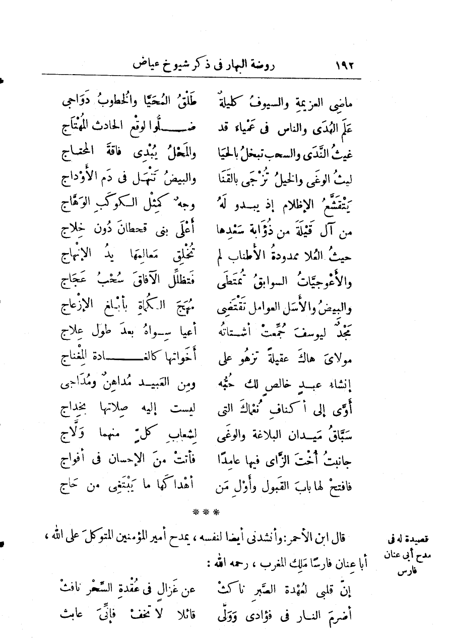 قال ابن الأحمر: وأنشدني أيضاً لنفسه، يمدح أمير المؤمنين المتوكل على الله أبا عنان فارساً ملك المغرب، رحمه الله: