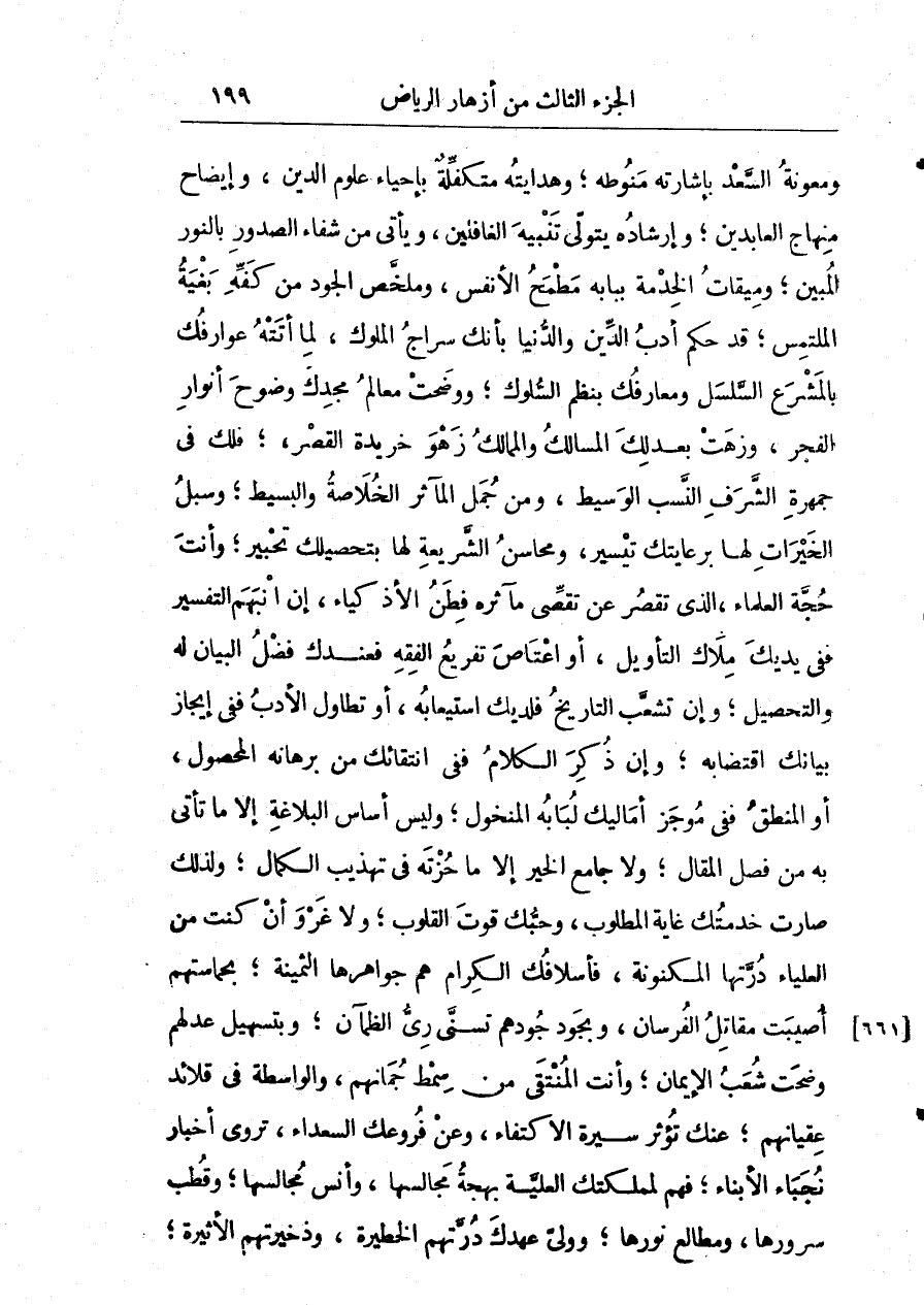 ومعونة السعد بإرشاته منوطة وهدايته متكفلة بإحياء علوم الدين وإيضاح منهاج العابدين وإرشاده يتولى تنبيه الغافلين ويأتي من شفاء الصدور بالنور المبين وميقات الخدمة ببابه مطمح الأنفس وملخص الجود من كفة بغية المتلمس قد حكم أدب الدين والدنيا بأنك سراج الملوك لمّا أتته عوارفك بالمشرع السلسل ومعارفك بنظم السلوك ووضحت معالم مجدك وضوح أنوار الفجر وزهت بعدلك المسالك والممالك زهو خريدة القصر فلك في جمهرة الشرف النسب الوسيط ومن جمل المآثر الخلاصة والبسيط وسبل الخيرات لها برعايتك تيسير ومحاسن الشريعة لها بتحصيلك تحبير وأنت حجة العلماء الذي تقصر عن قصي مآثره فطن الأذكياء إنْ أنبههم التفسير ففي يديك ملاك التأويل أو اعتاص تفريع الفقه فعندك فضل البيان له والتحصيل وإنْ تشعب التاريخ فلديك استيعابه أو تطاول الأدب ففي إيجاز بيانك اقتضابه وإنْ ذكر الكلام ففي انتقائك من برهانه المحصول أو المنطق ففي موجز أماليك لبابه المنخول وليس أساس البلاغة إلاّ ما تأتي به من فصل المقال ولا جامع الخير إلاّ ما حزته في تهذيب الكمال ولذلك صارت خدمتك غاية المطلوب وحبك قوت القلوب وغزو أنْ كنت من العلياء درتها المكنونة فأسلافك الكرام هم جواهرها الثمينة بحمامتهم أصيب مقاتل الفرسان وبجود جودهم تسني ري الظمآن وبتسهيل عدلهم وضحت شعب الإيمان وأنت المنتقى من سمط جمانها والواسطة في قلائد عقيانها عنك تؤثر سيرة الاكتفاء وعن فروعك السعداء تروى أخبار نجباء الأنباء فهم لمملكتك العلية بهجة مجالسها وانس مجالسها وقطب سرورها ومطالع نورها وولي عهدك درتهم الخطيرة وذخيرتهم الأثيرة