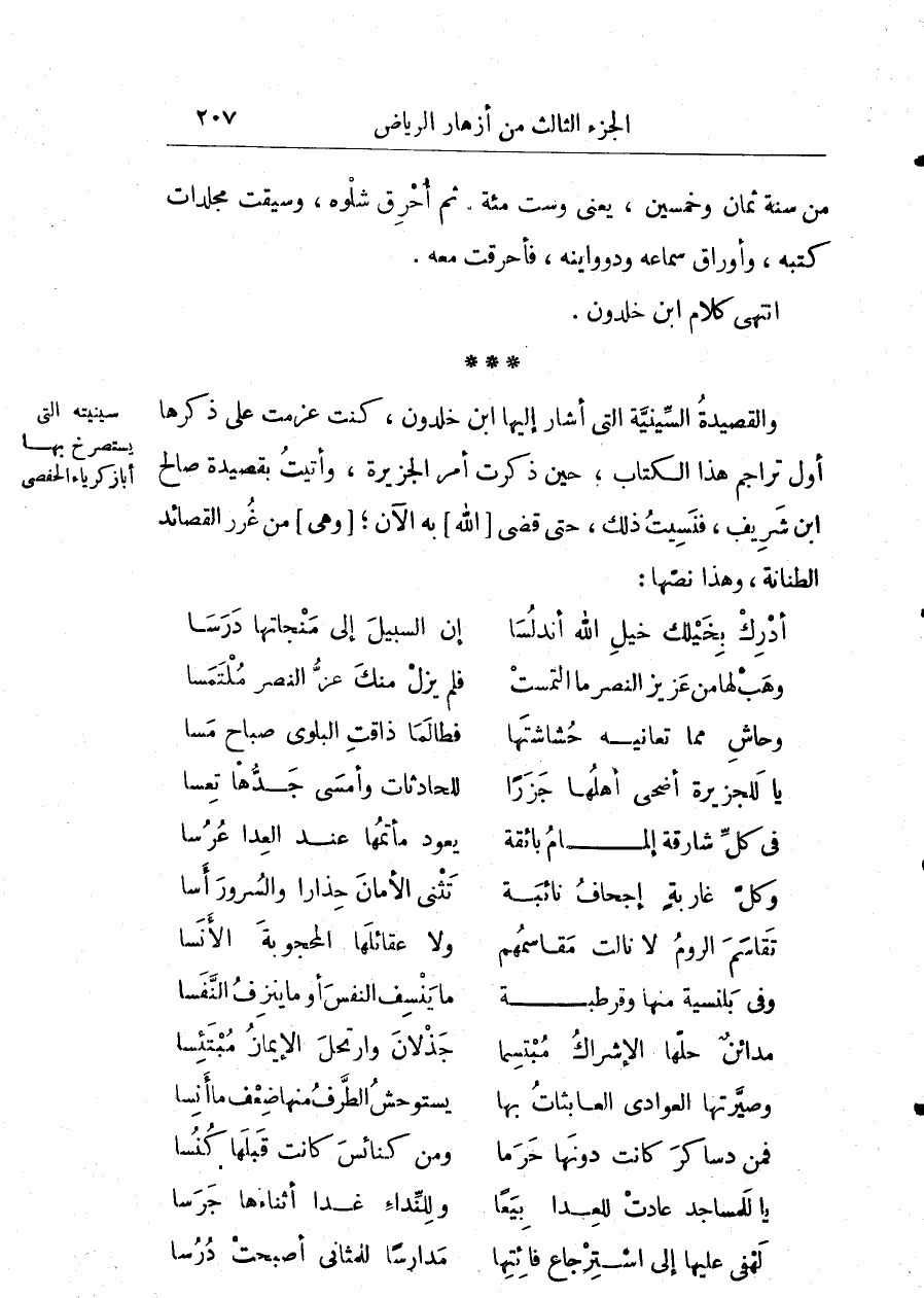 والقصيدة السينية التي أشار إليها ابن خلدون، كنت عزمت على ذكرها أوّل تراجم هذا الكتاب، حين ذكرت أمر الجزيرة، وأتيت بقصيدة صالح ابن شريف، فنسيت ذلك، حتى قضى الله به الآن؛ وهي من غرر القصائد الطنانة، وهذا نصها: