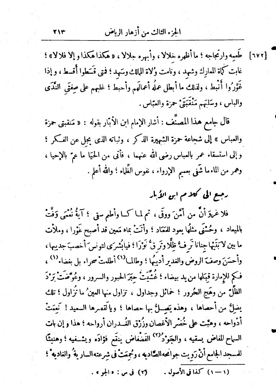 قال جامع هذا المصنف: أشار الإمام ابن الأبار بقوله: " منقبتي حمزة والعباس " إلى شجالعة حمزة الشهير الذكر وثباته الذي يجعل عن الفكر وإلى استسقاء عمر بالعباس رضي الله عنهما فأتى من الحيا ما عم بالحيا وهمر من الماء ما شفي بعميم الإرواء نفوس الظماء الله اعلم.