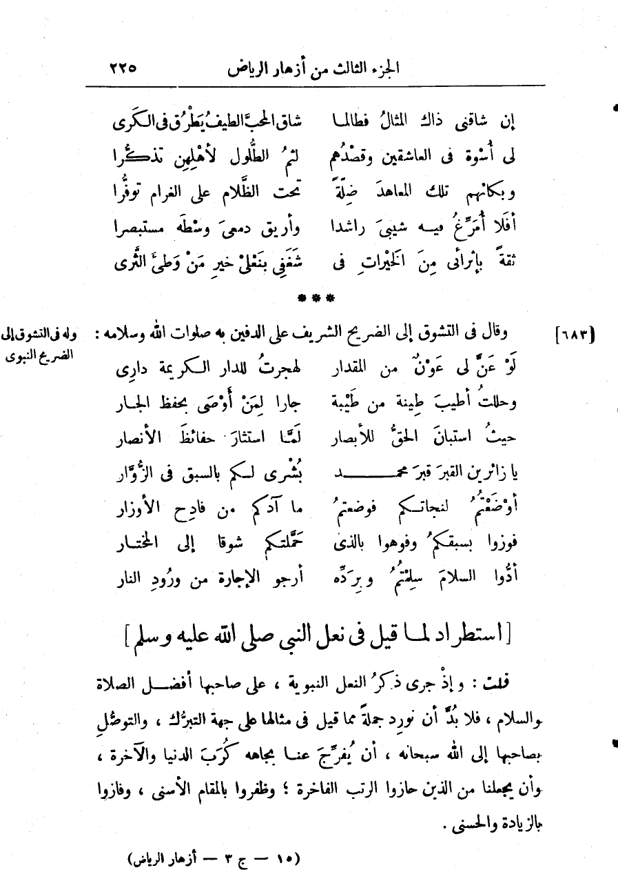استطراد لمّا قيل في نعل النبي صلى الله عليه وسلم: قلت: وإذ جرى ذكر النعل النبوية، على صاحبها أفضل الصلاة والسلام، فلا بد أنَّ نورد جملة مما قيل في مثالها على جهة التبرك، والتوصل بصاحبها إلى الله سبحانه، أنَّ يفرج عنا بجاهه كرب الدنيا والآخرة، وأنَّ يجعلنا من الذين حازوا الرتب الفاخرة، وظفروا بالمقام الأسني، وفازوا بالزيادة والحسنى.