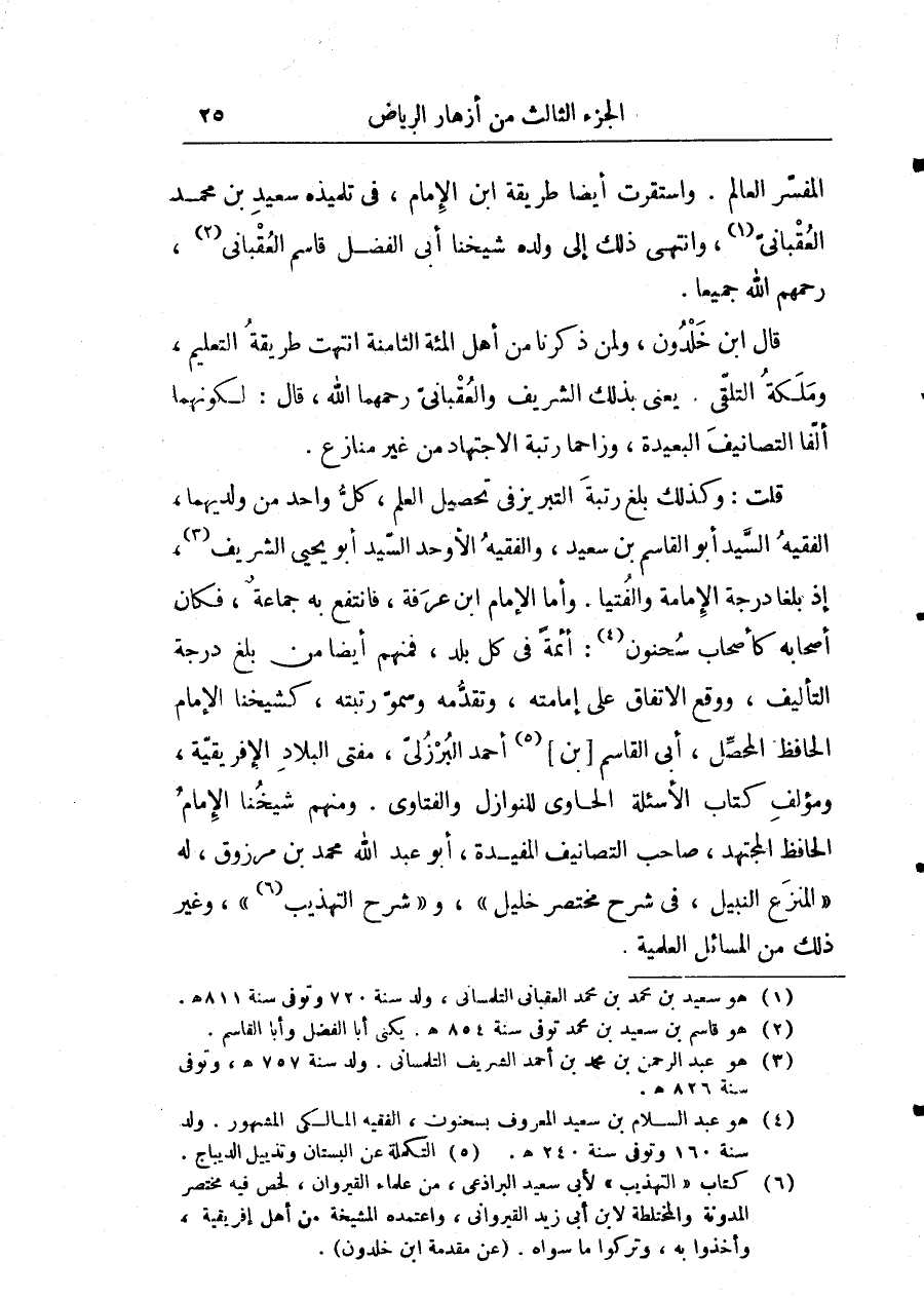 المفسر العالم. واستقرت أيضاً طريقة ابن الإمام، في تلميذه سعيد بن محمّد العقباني، وانتهى ذلك إلى ولده شيخنا أبي الفضل قاسم العقباني، رحمهم الله جميعا. قال ابن خلدون، ولمن ذكرنا من أهل المائة الثامنة انتهت طريقة التعليم، وملكة التلقي. يعني بذلك الشريف والعقباني رحمهما الله تعالى، قال: لكونهما ألفا التصانيف البعيدة، وزاحما رتبة الاجتهاد من غير منازع.