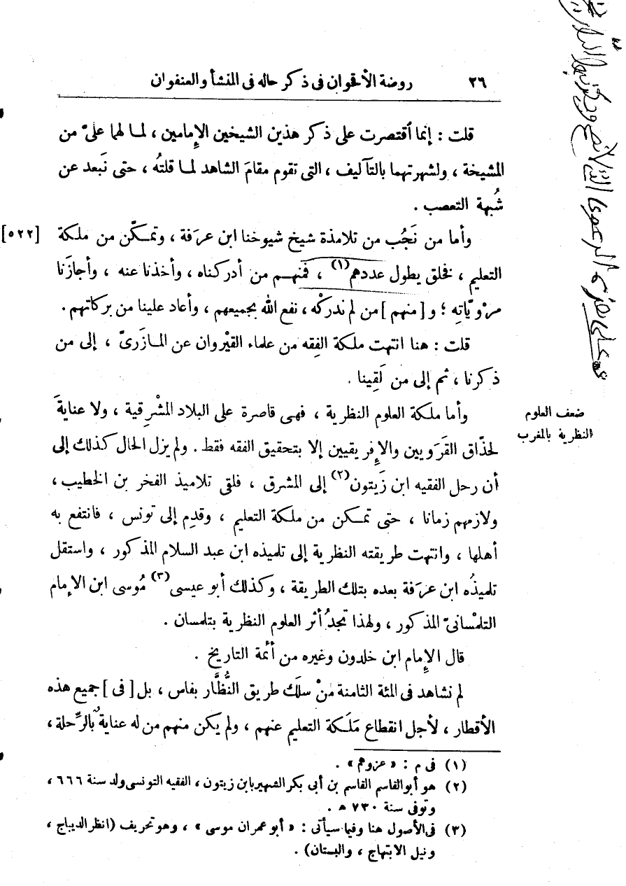 وأما ملكة العلوم النظرية، فهي قاصرة على البلاد المشرقية، ولا عناية لحذاق القرويين والإفريقيين إلاّ بتحقيق الفقه فقط. ولم يزل الحال كذلك إلى أن رحل الفقيه ابن زيتون إلى الشرق، فلقي تلاميذ الفخر بن خطيب، ولازمهم زمانا، حتى تمكن من ملكة التعليم، وقدم إلى تونس، فانتفع به أهلها، وانتهت طريقته النظرية إلى تلميذه ابن عبد السلام المذكور، واستقل تلميذه بن عرفة بعده بتلك الطريقة، وكذلك أبو عيسى موسى ابن الإمام التلمساني المذكور ولهذا تجد أثر العلوم النظرية بتلمستان.