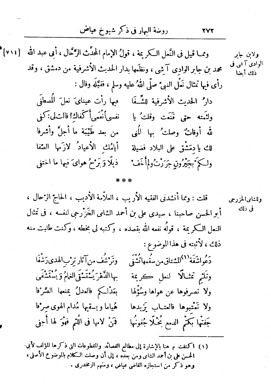 قلت ومما أنشدني الفقيه الأريب العلامة الأديب الحاج الرحال أبو الحسن صاحبنا سيدي عليّ بن أحمد الشامي الخزرجي لنفسه في تمثال النعل الكريمة قوله نفعه الله بقصده وكتبه لي بخطه وكنت طلبت منه ذلك لأثبته في هذا الموضوع: