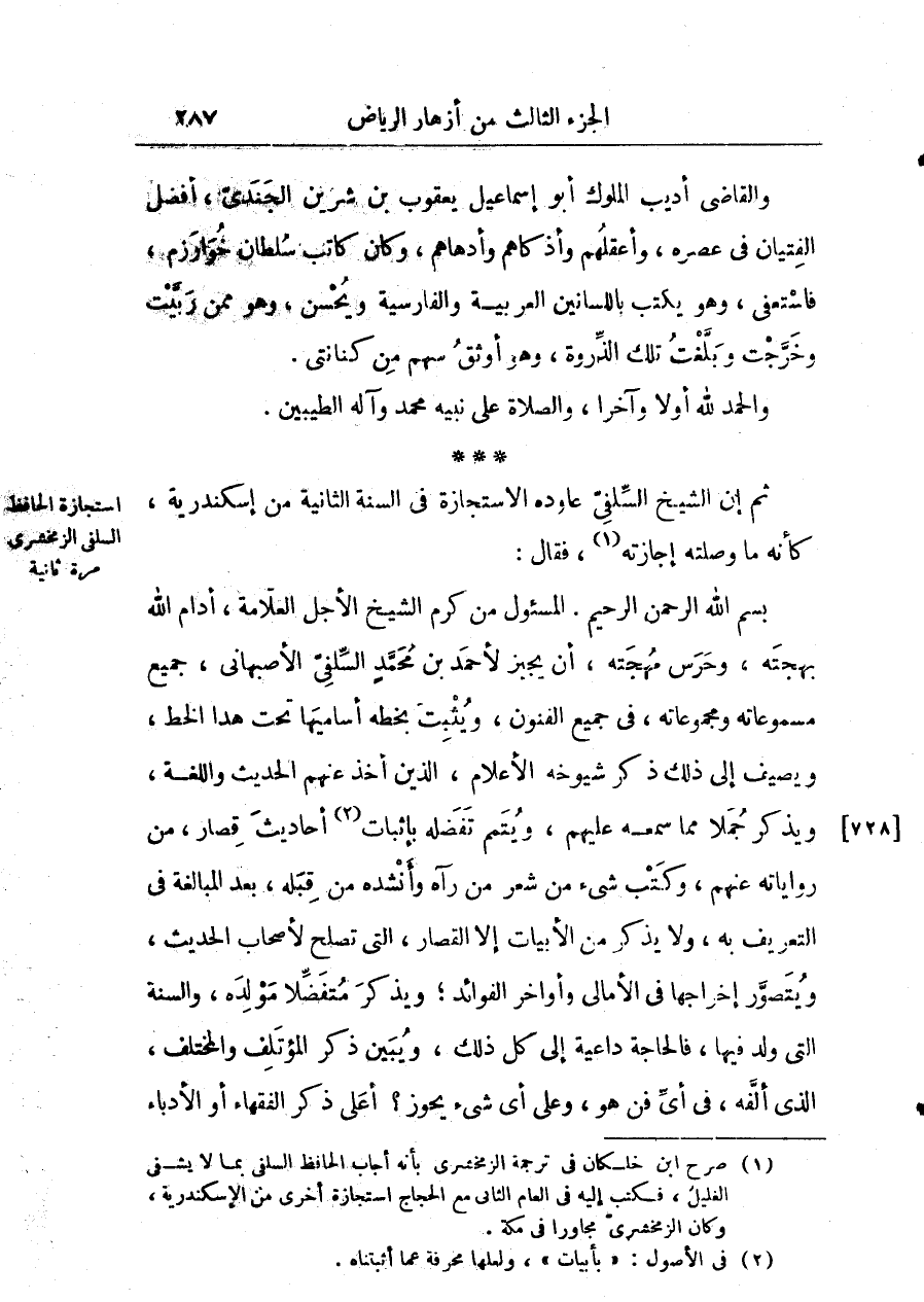 بسم الله الرحمن الرحيم. المسئول من كرم الشيخ الأجل العلامة أدام الله بهجته وحرس مهجته أنْ يجيز لأحمد بن محمّد السلفي الأصبهاني جميع مسموعاته ومجموعاته في جميع الفنون ويثبت بخطه أساميها تحت هذا الخط ويضيف إلى ذلك ذكر شيوخه الأعلام الذين أخذ عنهم الحديث واللغة ويذكر جملا مما سمعه عليهم ويتمم تفضيله بإثبات أحاديث قصار من رواياته عنهم وكتب شيء من شعر من رآه وأنشده من قبله بعد المبالغة في التعريف به ولا يذكر من الأبيات إلاّ القصار التي تصلح لأصاب الحديث ويتصور إخراجها في الأمالي وأواخر الفوائد ويذكر متفضلا مولده والسنة التي ولد فيها فالحاجة داعية إلى كل ذلك ويبين ذكر الموتلف والمختلف الذي ألفه في أي فن هو وعلى أي شيء يجوز؟ أعلى ذكر الفقهاء أو الأدباء