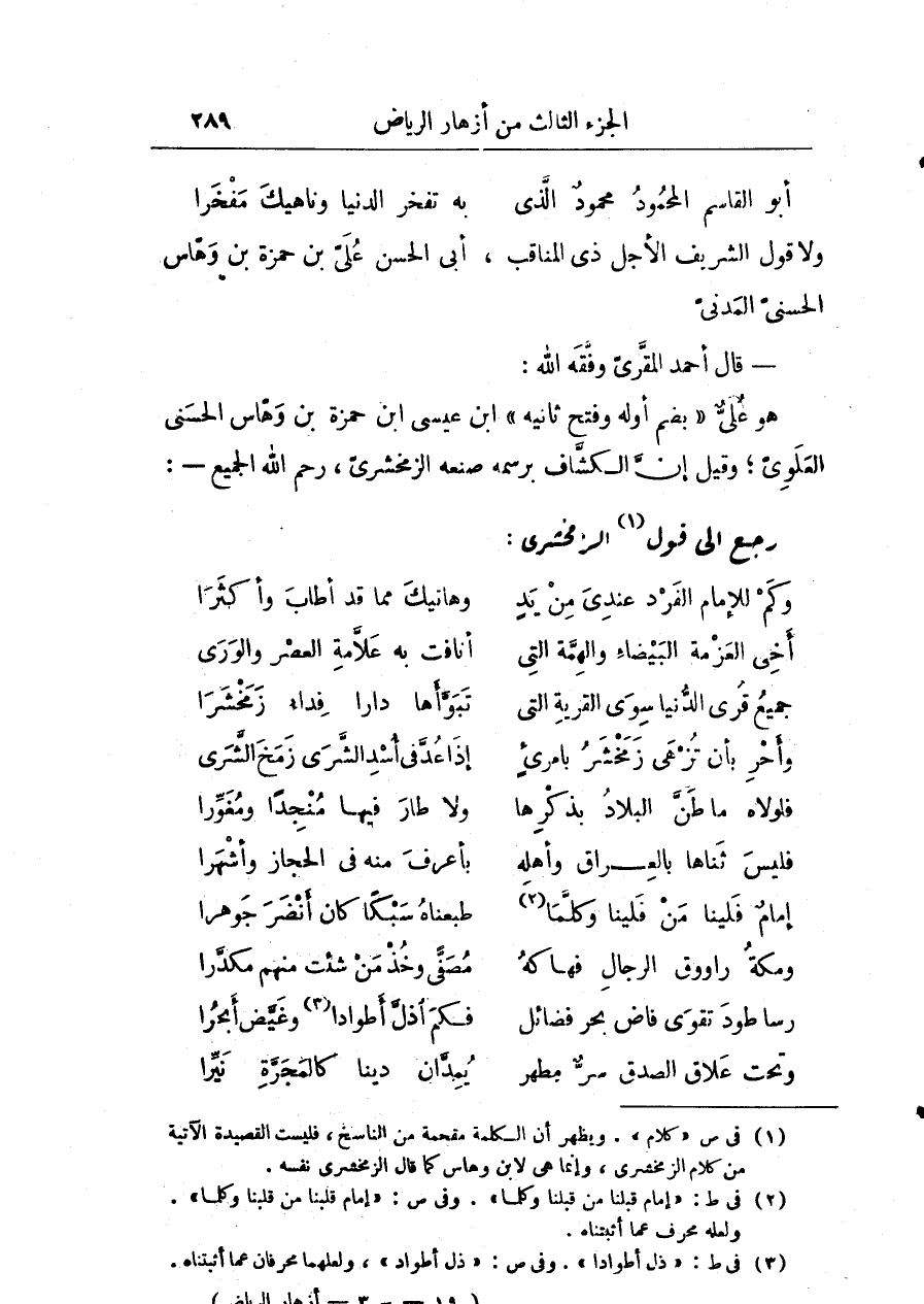 قال أحمد المقري وفقه الله: هو عليّ بضم أوله وفتح ثانيه ابن عيسى ابن حمزة بن وهاس الحسني العلوي وقيل إنَّ الكشاف برسمه صنعه الزمخشري رحم الله الجميع.