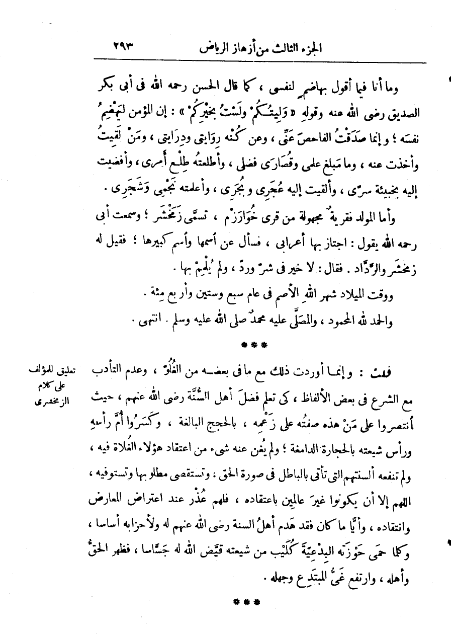 وأما المولد فقرية مجهولة من قرى خوارزم تسمى زمخشر وسمعت أبي رحمه الله يقول: اجتاز بها أعرابي فسأل عن أسمها واسم كبيرها فقيل له مخشر والرداد. فقال: لا خير في شر ورد ولم يلمم بها.