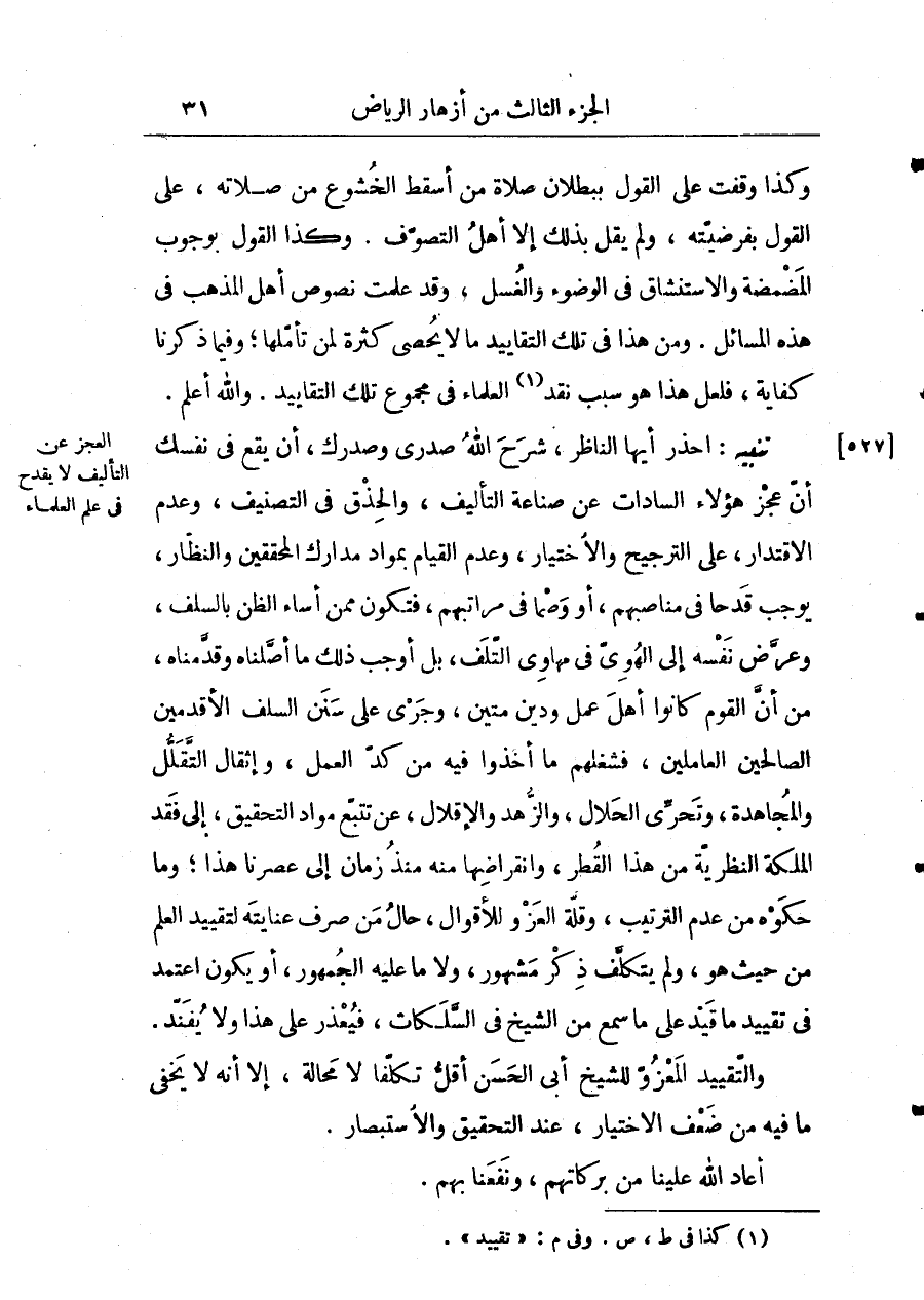 تنبيه: أحذر أيّها الناظر، شرح الله صدري وصدرك، أنَّ يقع في نفسك أنَّ عجز هؤلاء السادات عن صناعة التأليف، والحذق في التصنيف، وعدم الاقتدار، على الترجيح والاختيار، وعدم القيام بمواد مدارك المحققين والنظار، يوجب قدحا في مناصبهم، أو وصما في مراتبهم، فتكون ممن أساء الظن بالسالف، وعرض نفسه إلى الهوى في مهاوي التلف، بل أوجب ذلك ما أصلناه وقدمناه، من أنَّ القوم كانوا أهل عمل ودين متين، وجرى على سنن السلف الأقدمين الصالحين العاملين، فشغلهم ما أخذوا فيه من مدينة العمل، وإثقال التقلل والمجاهدة، وتحري الحلال، والزهد والإقلال، عن تتبع مواد التحقيق، إلى فقد الملكة النظرية من هذا القطر، وانقراضها منه منذ زمان إلى عصرنا هذا: وما حكوه من عدم الترتيب، وقلة العزو للأقوال، حال من صرف عنايته لتقييد العلم من حيث هو، ولم يتكلف ذكر مشهور، ولا ما عليه الجمهور، أو يكون اعتمد في تقييد ما قيد على ما سمع من الشيخ في السلكات، فيعذر على هذا ولا يفند. والتقييد المعزو للشيخ أبي الحسن اقل تكلفا لا محالة، إلاّ أنّه لا يخفى ما فيه من ضعف الاختيار، عند التحقيق والاستبصار.