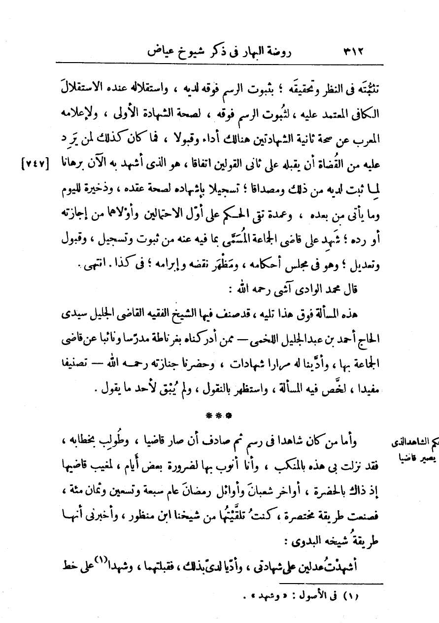 تثبته في النظر وتقيقه، بثبوت الرسم فوقه لديه، واستقلاله عنده الاستقلال الكافي المعتمد عليه، لثبوت الرسم فوقه، لصحة الشهادة الأولى، ولإعلامه المعرب عن صحة ثانية الشاهدتين هنالك أداء وقبولاً، فما كان كذلك لمن يرد عليه من القضاة أنْ يقبله على ثاني القولين اتفاقاً، هو الذي أشهد به الآن برهاناً لمّا ثبت لديه من ذلك ومصداقاً؛ تسجيلاً بإشهاده لصحة عقده، وذخيرة لليوم وما يأتي من بعده، وعمدة تقي الحكم على أمل الاحتمالين وأولاهما من إجازته أو رده؛ شهد على قاضي الجماعة المسمى بما فيه عنه من ثبوت وتسجيل وقبول وتعديل؛ وهو في مجلس أحكامه، ومظهر نقضه وإبرامه؛ في كذا. انتهى.