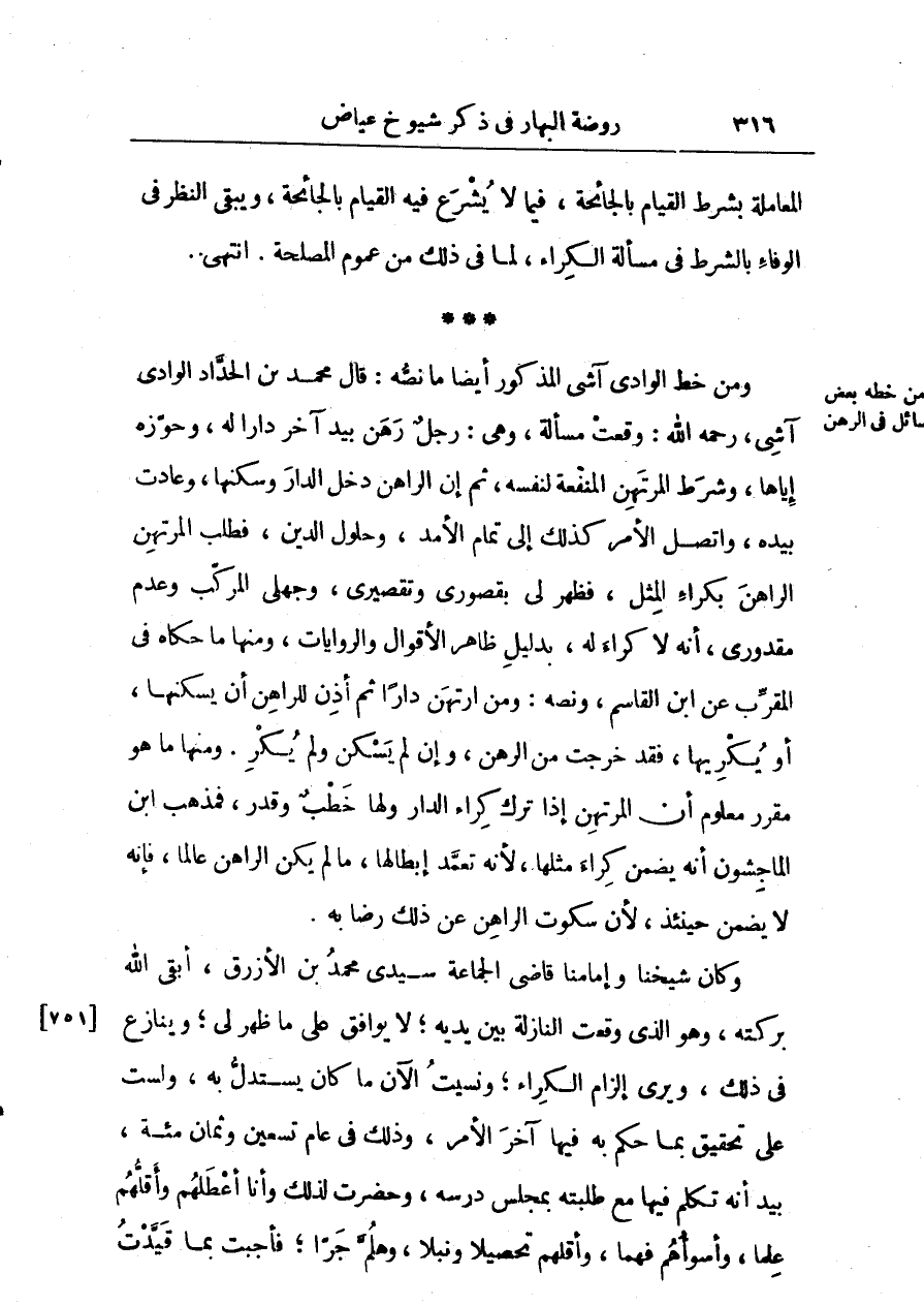 وكان شيخنا وإمامنا قاضي الجماعة سيدي محمّد بن الأزرق، ابقى الله بركته، وهو الذي وقعت النازلة بين يديه؛ لا يوافق على ما ظهرلي؛ وينازع في ذلك ويرى إلزام الكراء؛ ونسيت الآن ما كان يستدل به، ولست على تحقيق بما حكم بهفيها آخر الأمر، وذلك في عام تسعين وثمان مائة، بيد أنَّه تكلم فيها مع طلبته بمجلس درسه، وحضرت لذلك وأنا أعطلهم وأقلهم علماً، وأسوئهم فهماً، وأقلهم تحصيلاً ونبلاً، وهلم جرا؛ فأجبت بما قيدت