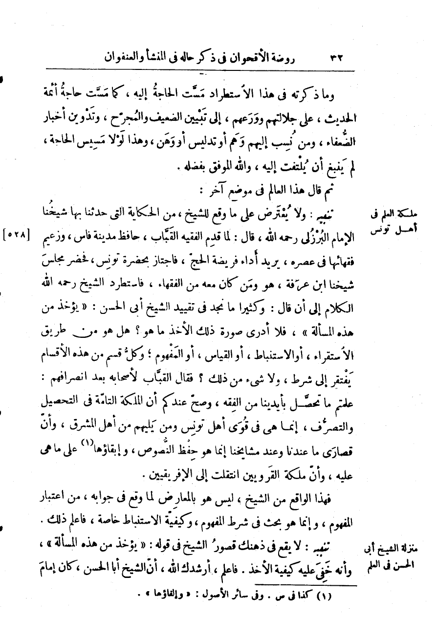 ثم قال هذا العالم في موضع آخر: تنبيه: ولا يعترض على ما وقع للشيخ، من الحكاية التي حدثنا بها شيخنا الإمام البرزلي رحمه الله، قال: لمّا قدم الفقيه القباب، حافظ مدينة فاس، وزعيم فقهائها في عصره، يريد أداء فريضة الحج، فاجتاز بحضرة تونس، فحضرة مجلس شيخنا ابن عرفة، هو ومن كان معه من الفقهاء، فاستطرد الشيخ رحمه الله الكلام إلى إنَّ قال: وكثيرا ما نجد في تقييد الشيخ أبي الحسن: " يؤخذ من هذه المسألة "، فلا أدري صورة ذلك الأخذ ما هو؟ هل هو من طريق الاستقراء، أو الاستنباط، أو القياس، أو المفهوم؛ وكل قسم من هذه الأقسام يفتقر إلى شرط، ولا شيء من ذلك؟ فقال القباب لأصحابه بعد انصرافهم: علمتم ما تحصل بأيدينا من الفقه، وصح عندكم أنَّ الملكة التامة في التحصيل والتصرف، إنّما هذا في قوى أهل تونس ومن يليهم من أهل المشرق، وإنَّ قصارى ما عندنا وعند مشايخنا إنّما هو حفظ المنصوص، وإبقاؤها على ما هي عليه، وأنَّ ملكة القروبين انتقلت إلى الأفريقيين.