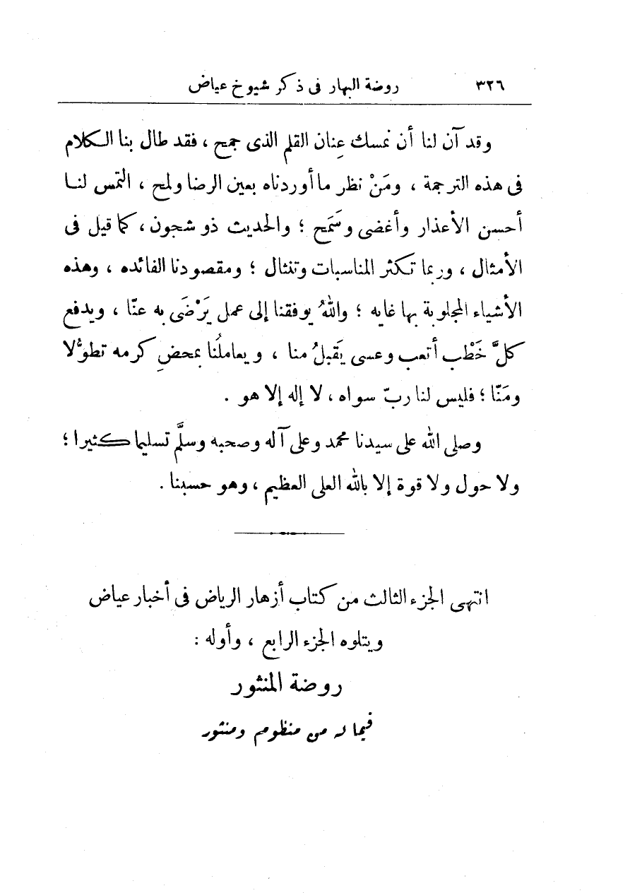 وقد آن لنا أنْ نمسك عنان القلم الذي جمح، فقد طال بن الكلام في هذه الترجمة، ومن نظر ما أوردنا بعين الرضا ولمح، التمس لنا أحسن الأعذار وأغضى وسمح، والحديث ذو شجون، وكما قيل في الامثال، وربما تكثر المناسبات وتنثال؛ ومقصودنا الفائدة، وهذه الأشياء المجلوبة بها غاية، والله يوفقنا إلى عمل يرضي به عنا، ويدفع كل خطب أتعب وعسى يقبل منا، ويعاملنا بمحض كرمه تطولا ومنا، فليس لنا رب سواه، لا اله إلاّ هو.