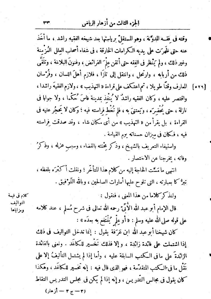 ولنذكر كلامنا من هذا المعنى، فنقول: قال الإمام أبو عبد الله الأبي رحمه الله تعالى في شرح مسلم، عند كلامه على قوله) : " أو علم ينتفع به بعده ": كان شيخنا أبو عبد الله ابن عرفة يقول: إنّما تدخل التواليف في ذلك ذا اشتملت على فائدة زائدة، وإلاّ فذلك تخسير للكاغد. ونعني بالفائدة الزائدة على ما في الكتب السابقة عليه، وأما إذا لم يشتمل التأليف إلاّ على نقل ما في الكتب المتقدمة، فهو الذي قال فيه: أنّه تخسير للكاغد، وهكذا كان يقول في مجالس التدريس، وأنّه إذا لم يكون في مجلس التدريس التقاط