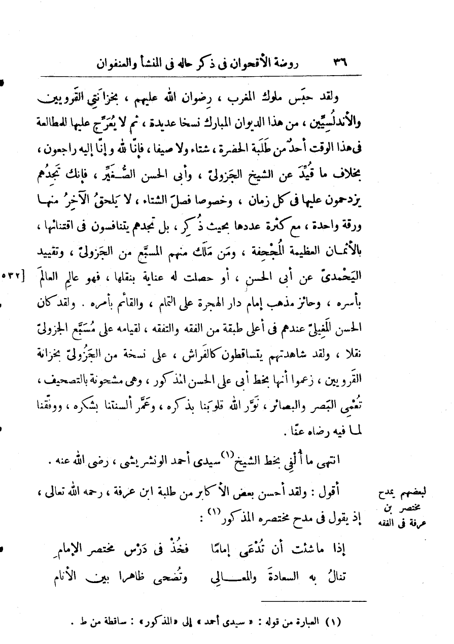 ولقد حبس ملوك المغرب، رضوان الله عليهم، بخزانتي القرويين والأندلس، من هذا الديوان المبارك نسخا عديدة، ثم لا يعرج عليها للمطالعة في هذا الوقت أحد من الطلبة الحضرة، شتاء ولا صيفا، فأنا لله وأنا إليه راجعون، بخلاف ما قيد عن الشيخ الجزولي، وأبي الحسن الصغير، فإنك تجدهم يزدحمون عليها في كل زمان، وخصوصا فصل الشتاء، لا يلحق الآخر منها ورقة واحدة، مع كثرة عددها بحيث ذكر، بل تجدهم يتنافسون في اقتنائها، بالأثمان العظيمة المجحفة، ومن ملك منهم المسبع من الجزولي، وتقييد اليحمدي، وحائر مذهب إمام دار الهجرة على التمام، والقائم بأمره. ولقد كان الحسن المغيلي عندهم في أعلى طبقة من الفقه والتفقه، لقيامه على مسبع الجزولي نقلا، ولقد شاهدتهم يتساقطون كالفراش، على نسخة من الجزولي بجزالة القروين، وزعموا أنها بخط أبي الحسن المذكور، وهي مشحونة بالتصحيف، تعمى البصر والبصائر، نور الله قلوبنا بذكره، وعمر ألسنتنا بشكره، ووفقنا لمّا فيه رضاه عنا.